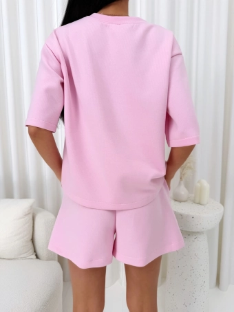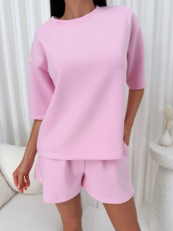 Pudrowy Prążkowany Komplet Bluzka + Spodenki 14887-117-D