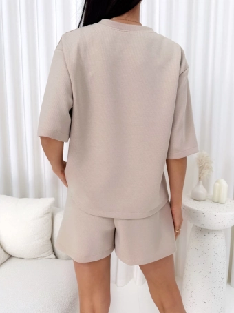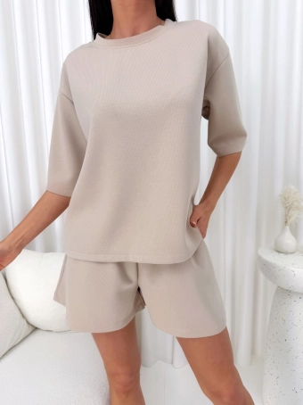 Beżowy Prążkowany Komplet Bluzka + Spodenki 14887-117-A