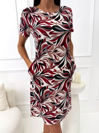 Beżowa Prosta Sukienka w Czerwony Wzór 14675-37-A