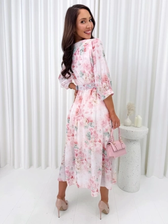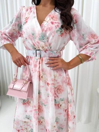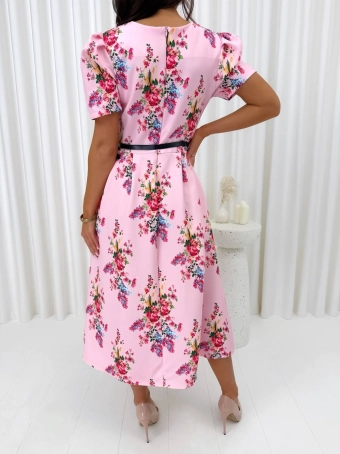 Pudrowa Sukienka z Bufiastymi Rękawami w Kwiaty 14927-296-B