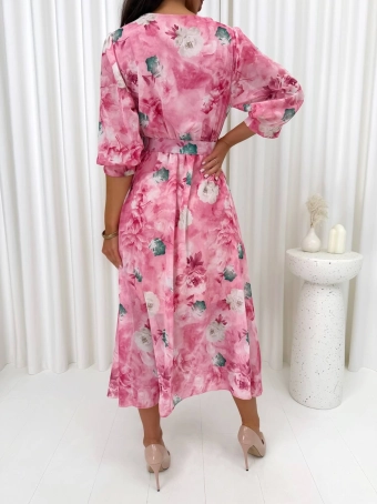 Różowa Sukienka w Kwiaty z Kopertowym Dekoltem 14929-510-Q