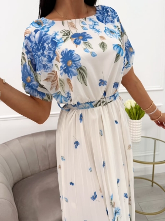 Niebiesko-Kremowa Sukienka z Motywem Kwiatowym i Paskiem 13961-80-B