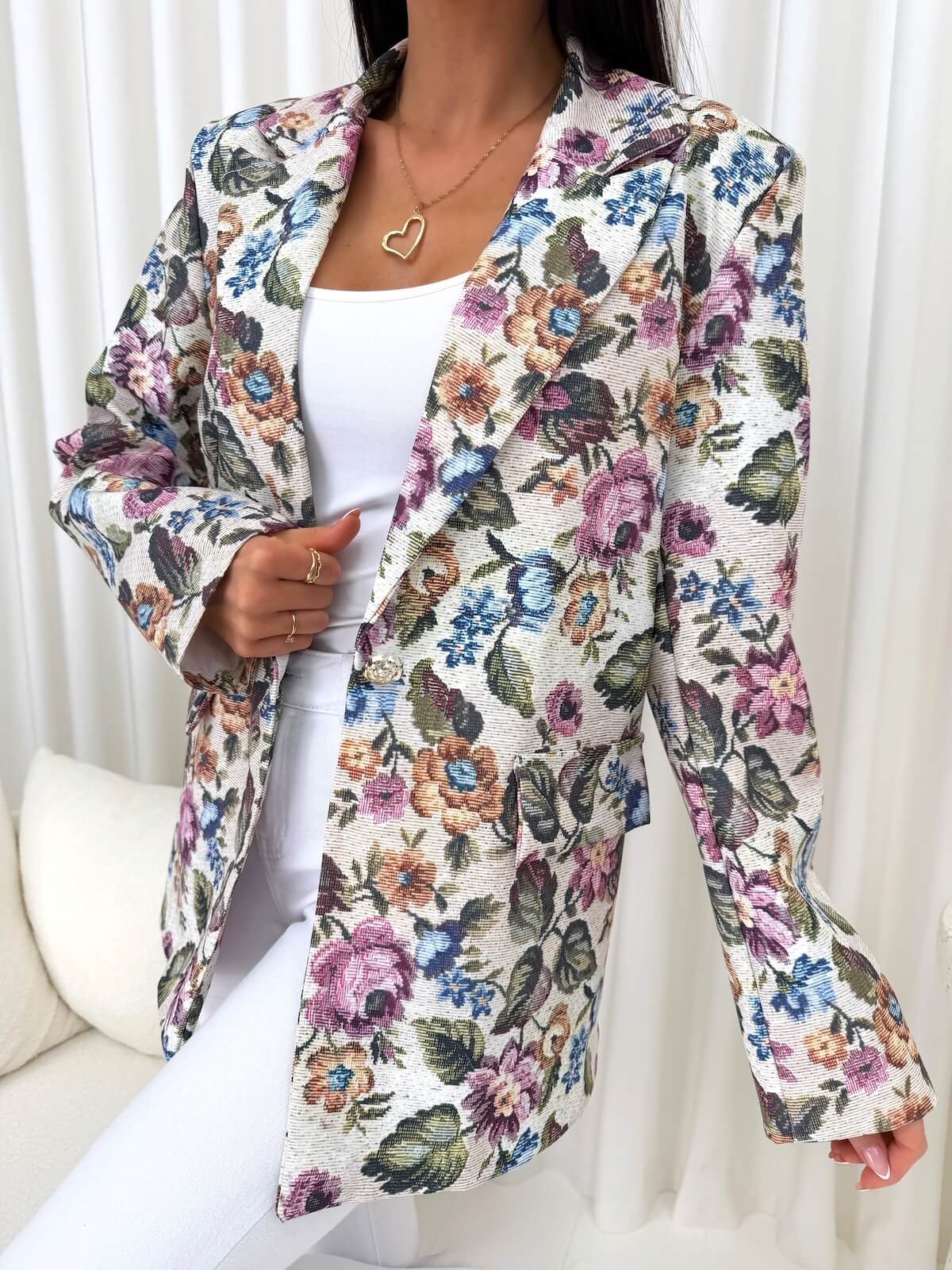 Beżowa marynarka w kwiaty ze złotym guzikiem to propozycja dla kobiet, które cenią elegancję w subtelnym, kobiecym wydaniu. Jasny beżowy kolor w połączeniu z kwiatowym motywem sprawia, że model prezentuje się lekko, stylowo i bardzo efektownie. Prosty fason pięknie układa się na sylwetce, dzięki czemu marynarka doskonale dopełnia zarówno codzienne, jak i bardziej dopracowane stylizacje. Złoty ozdobny guzik dodaje całości eleganckiego akcentu i przyciąga spojrzenia, podkreślając wyjątkowy charakter tego modelu.