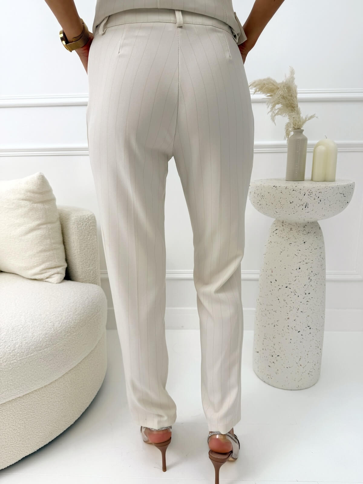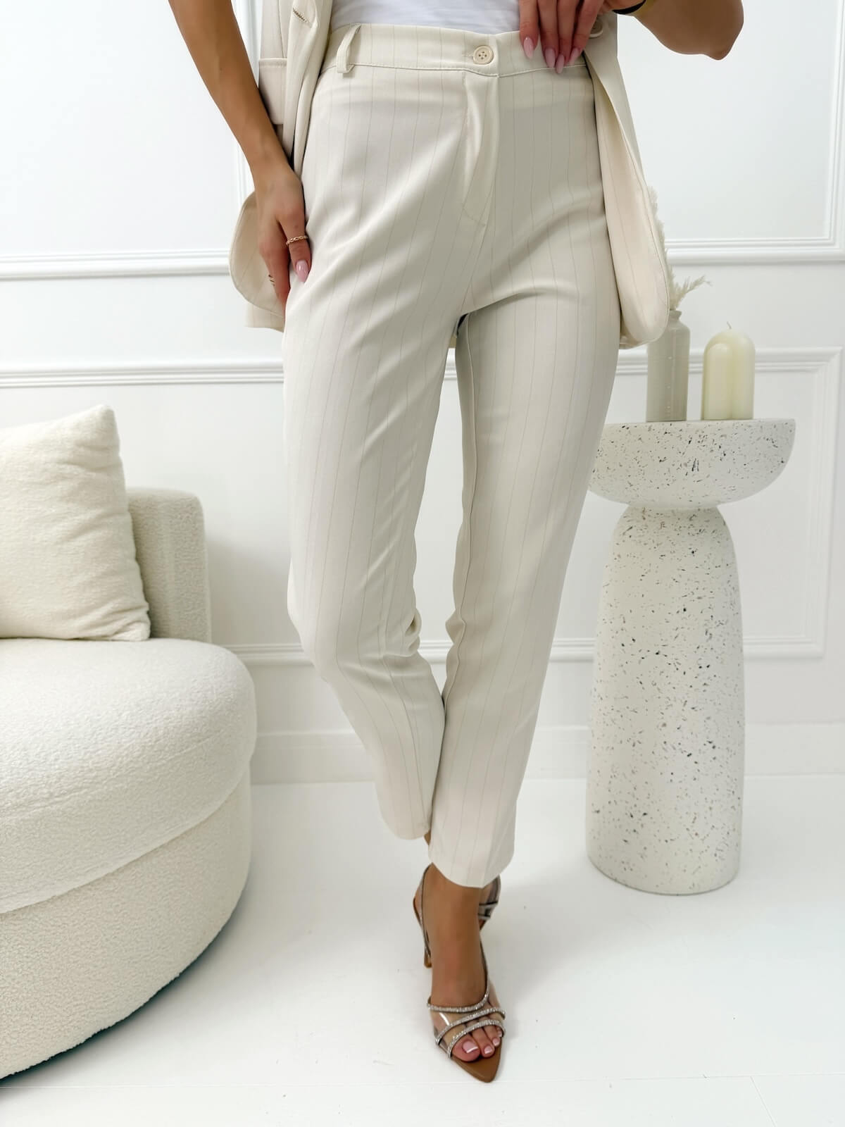 Spodnie materiałowe w cienkie paski to elegancka baza garderoby, która łączy klasykę z nowoczesnym fasonem. Lekko zwężane nogawki nadają sylwetce smukły wygląd i sprawiają, że całość prezentuje się lekko oraz proporcjonalnie. Zapięcie na guzik i suwak gwarantuje wygodne dopasowanie, a szlufki umożliwiają stylowe wykończenie paska. Model świetnie prezentuje się noszony samodzielnie, jak i w zestawieniu z kamizelką, tworząc dopracowany komplet idealny do pracy, na spotkania czy eleganckie wyjścia, gdy liczy się kobiecy i spójny look.