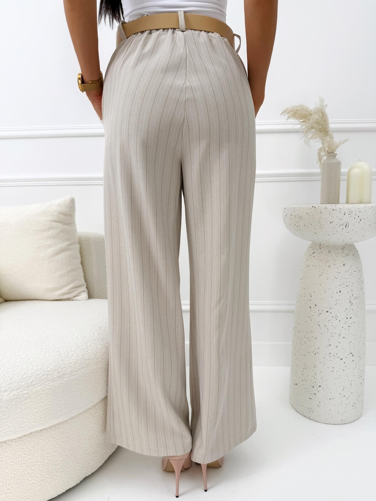 Beżowe Spodnie w Paski z Szerokimi Nogawkami