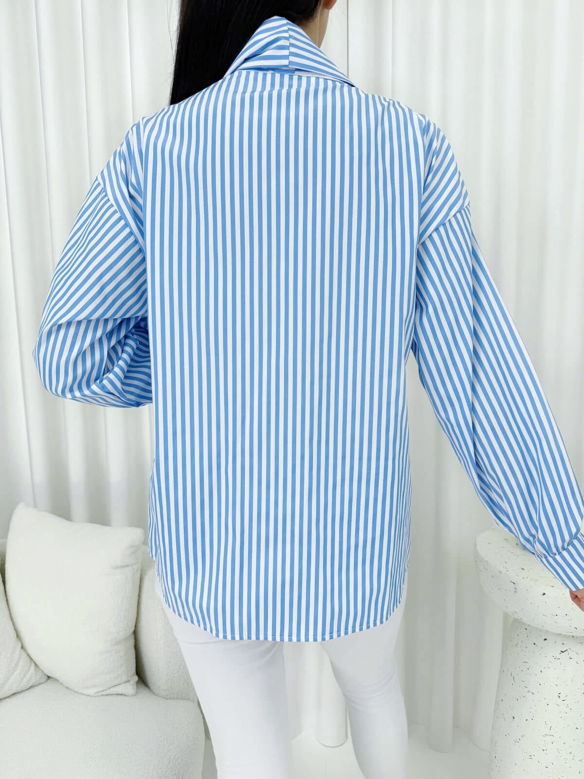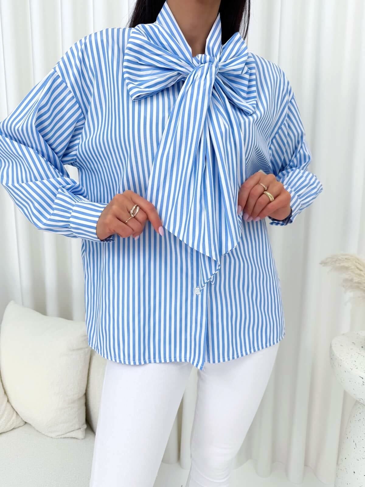 Błękitna koszula w paski z wiązaniem przy szyi to model, który łączy swobodę noszenia z subtelną elegancją. Luźny fason pięknie układa się na sylwetce, zapewniając komfort przez cały dzień i nadając stylizacji lekkości. Delikatny błękit oraz ponadczasowy wzór w paski sprawiają, że koszula prezentuje się świeżo, kobieco i bardzo stylowo. To propozycja idealna dla kobiet, które lubią ubrania efektowne, a jednocześnie uniwersalne – takie, które z łatwością można dopasować zarówno do codziennych, jak i bardziej eleganckich zestawów.