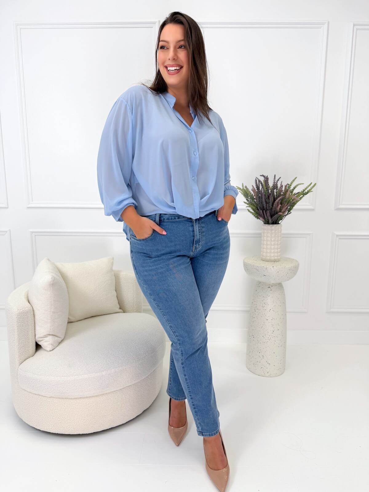 Bluzka w stylu koszuli w jednolitym kolorze to lekka i elegancka propozycja, która wyróżnia się subtelną formą i nowoczesnym wykończeniem. Luźny fason swobodnie układa się na sylwetce, zapewniając komfort noszenia i kobiecy wygląd. Szyfonowy, lekko prześwitujący materiał dodaje całości lekkości i sprawia, że bluzka prezentuje się wyjątkowo stylowo. Zapięcie na guziki oraz przekładany materiał u dołu tworzą ciekawy efekt wizualny, a możliwość zakładania przez głowę podkreśla jej oryginalny charakter. Długie rękawy czynią model uniwersalnym wyborem do pracy, na spotkania czy bardziej eleganckie wyjścia, kiedy liczy się dopracowana, a zarazem lekka stylizacja.