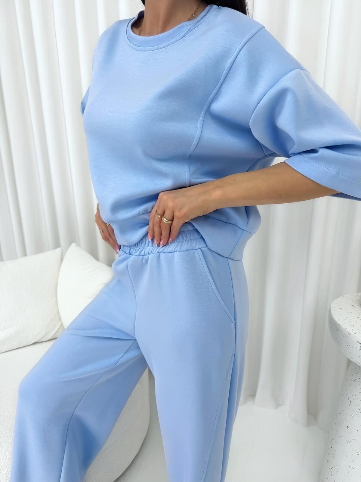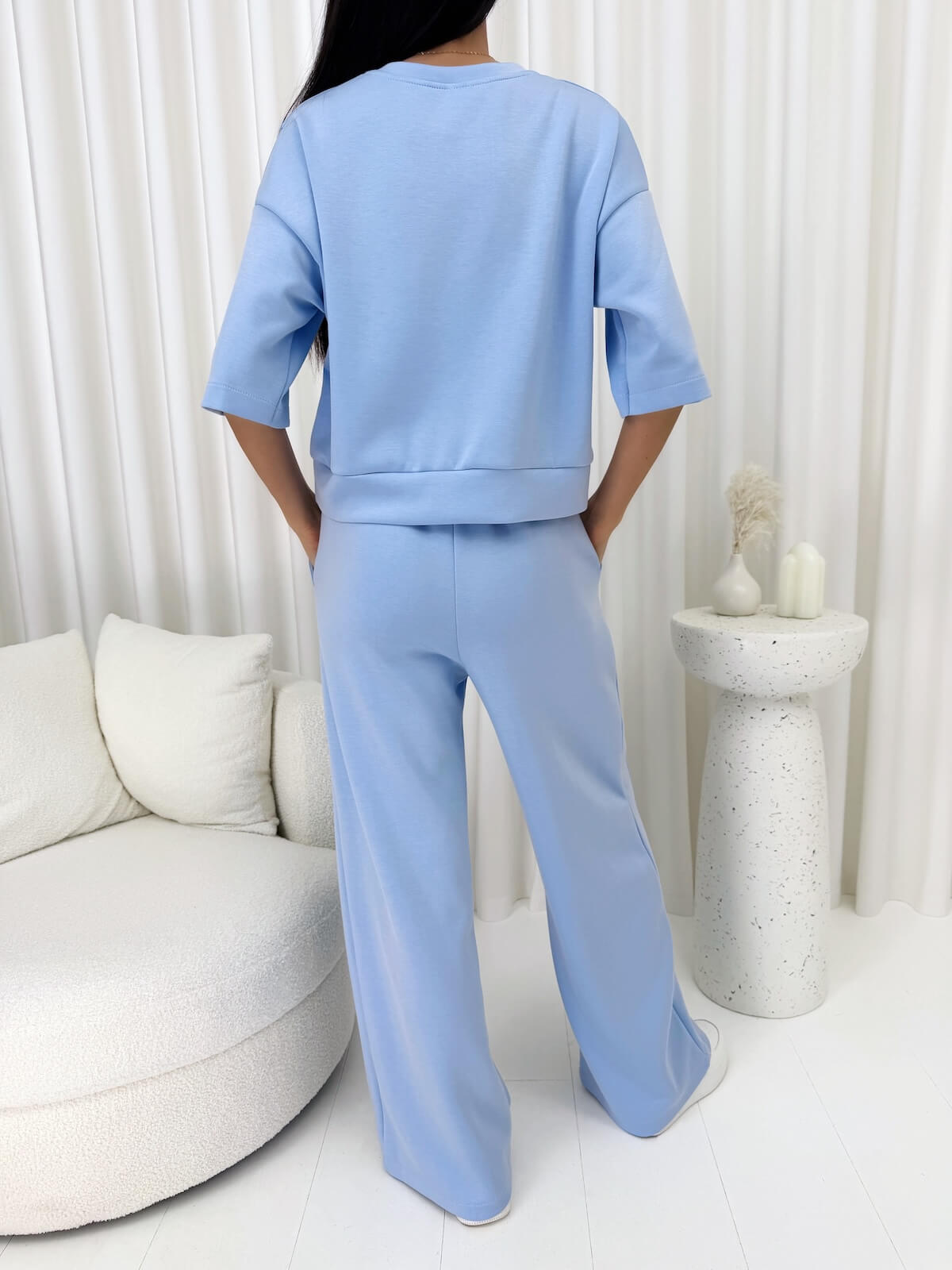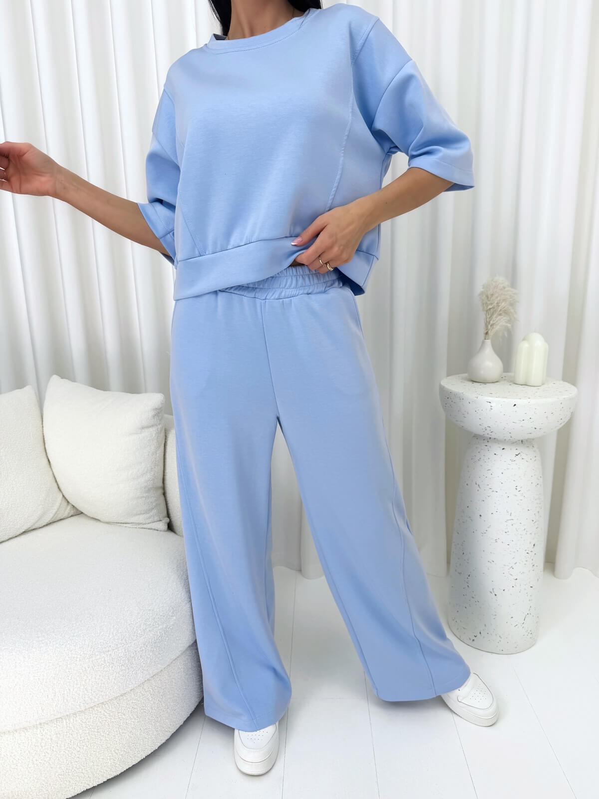 Błękitny komplet bluzka i spodnie to propozycja dla kobiet, które lubią połączenie wygody z lekkim, świeżym stylem. Luźny fason pięknie układa się na sylwetce, nadaje jej subtelności i sprawia, że całość prezentuje się swobodnie, a jednocześnie bardzo kobieco. Bluzka z krótkim rękawem i okrągłym dekoltem doskonale współgra ze spodniami o szerokich nogawkach, tworząc nowoczesny zestaw na wiele okazji. Błękitny kolor rozświetla stylizację i dodaje jej delikatnego, harmonijnego charakteru, dzięki czemu komplet świetnie sprawdza się zarówno na co dzień, jak i podczas wyjść.