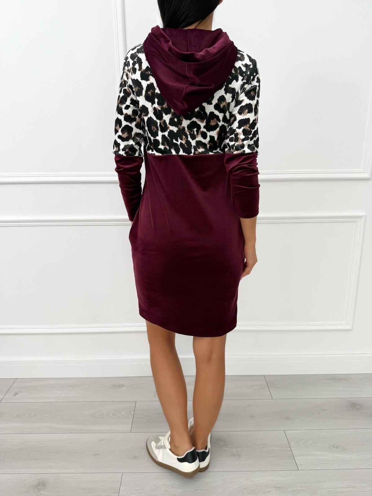 Bordowa Welurowa Sukienka w Panterkę 14320-401-A