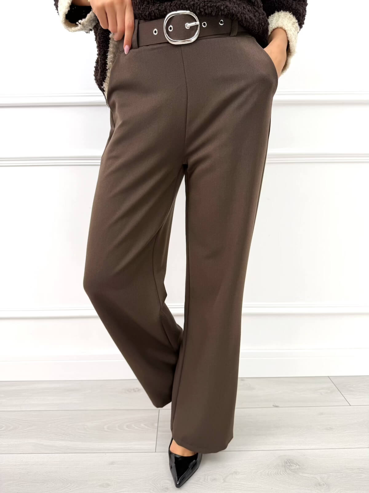 Eleganckie spodnie w kant o szerokich nogawkach to stylowy must-have, który doskonale wpisuje się w jesienne i wiosenne trendy. Gumka w talii z tyłu zapewnia komfort i idealne dopasowanie, a praktyczne kieszonki dodają funkcjonalności. Dołączony pasek pozwala podkreślić sylwetkę, nadając całości wyrafinowanego charakteru. Ten uniwersalny model świetnie sprawdzi się zarówno w biurowych, jak i casualowych zestawieniach, łącząc wygodę z ponadczasową klasą.