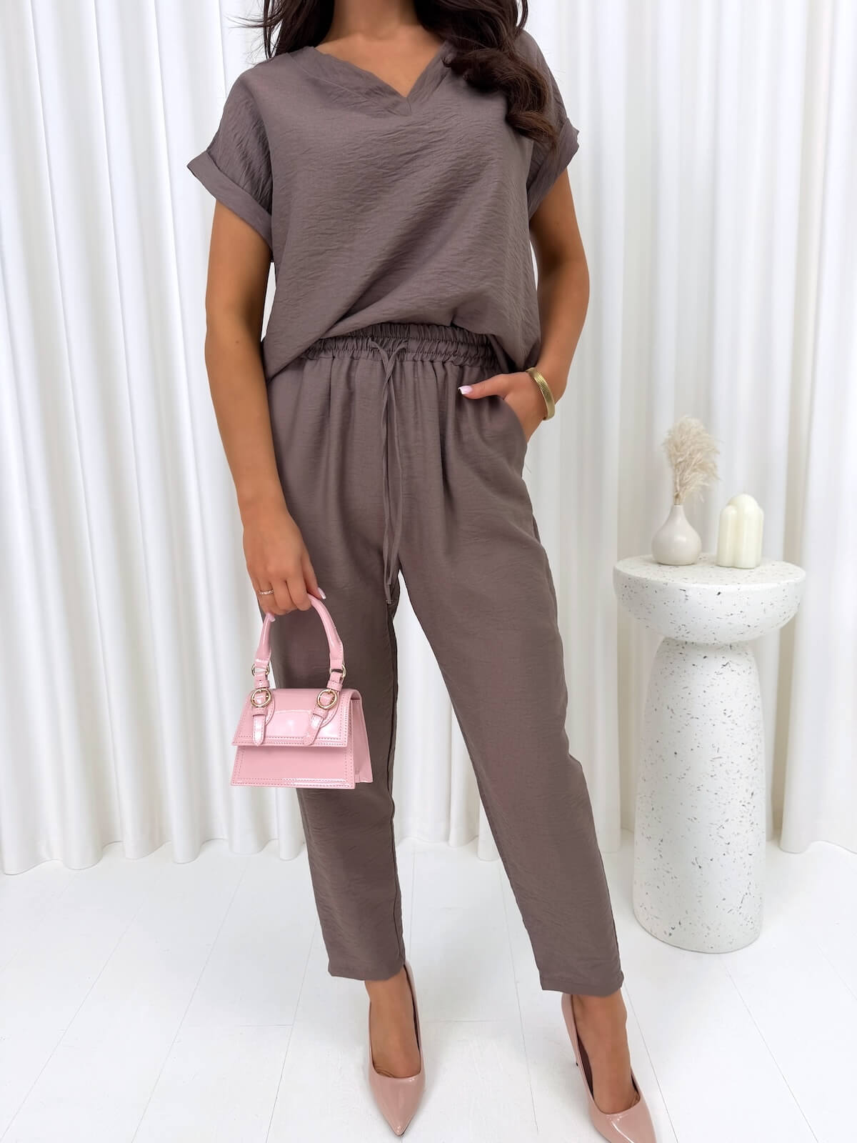 Brązowy dwuczęściowy wiskozowy komplet to propozycja dla kobiet, które cenią wygodę, swobodę ruchów i modny, dopracowany wygląd na co dzień. Luźny fason sprawia, że całość pięknie układa się na sylwetce, zapewnia komfort noszenia przez wiele godzin i pozwala tworzyć stylizacje bez wysiłku. Bluzka z dekoltem V subtelnie podkreśla górną część sylwetki, a spodnie z gumką w pasie i wiązaniem dobrze dopasowują się do figury, jednocześnie zachowując lekki, niewymuszony charakter. Brązowy kolor dodaje stylizacji ciepła, naturalnej elegancji i ponadczasowego wyrazu, dzięki czemu komplet świetnie sprawdzi się zarówno na co dzień, jak i podczas wyjazdu, spaceru czy spotkania w swobodnym stylu.