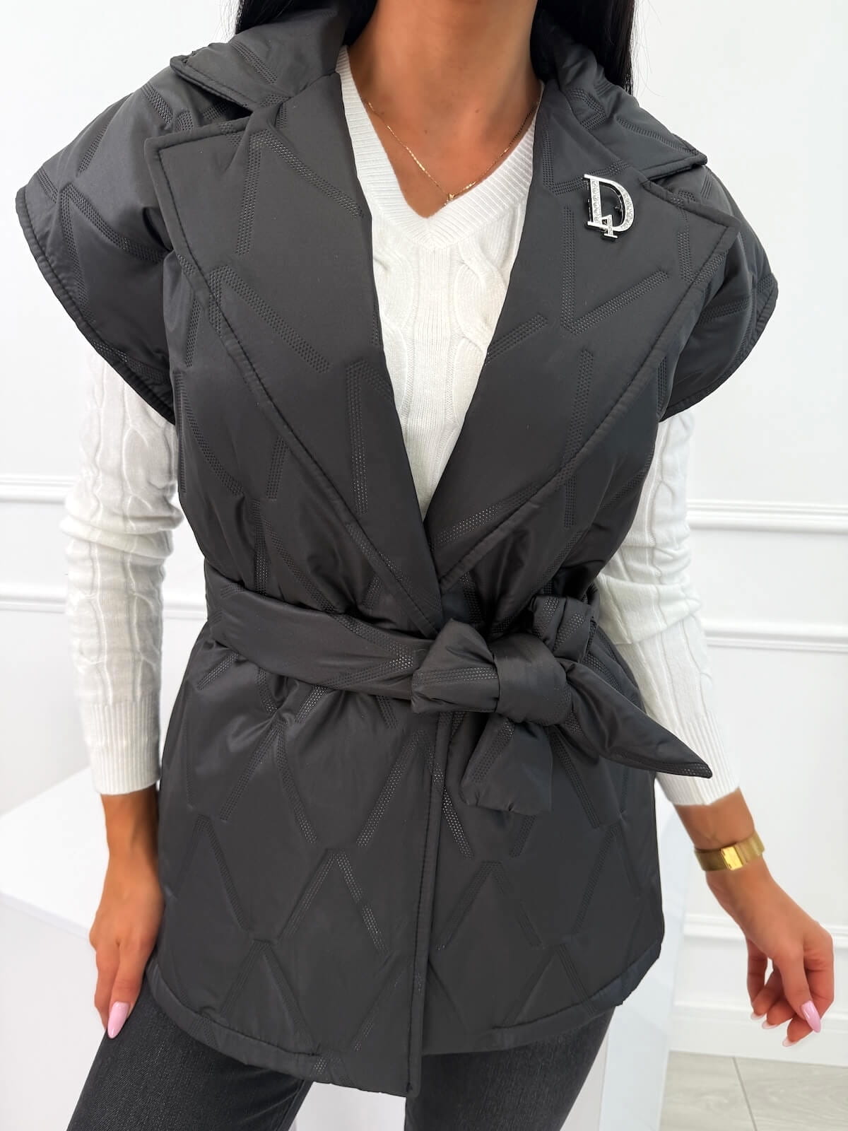 Pikowana kamizelka w jednolitym kolorze to stylowy dodatek, który świetnie sprawdza się w sezonie przejściowym. Zapinana na jeden guzik, z dołączonym paskiem podkreślającym talię, tworzy nowoczesny i kobiecy look. Z przodu znajduje się odczepiana broszka — subtelny detal, który dodaje charakteru i pozwala na personalizację stylizacji. Praktyczne kieszenie zwiększają funkcjonalność, nie zaburzając eleganckiego fasonu. Idealna na jesienne dni i wiosenne spacery. Uniwersalna propozycja dla osób, które cenią modę z nutą indywidualności.