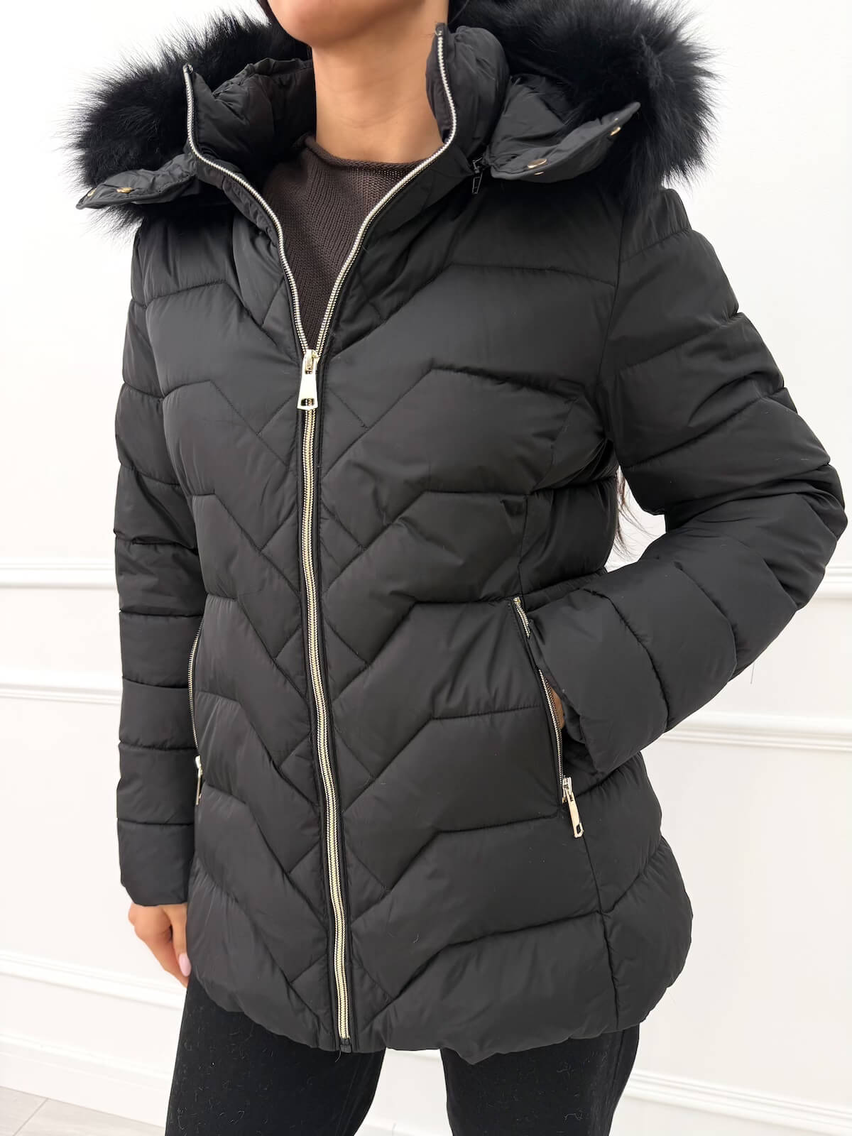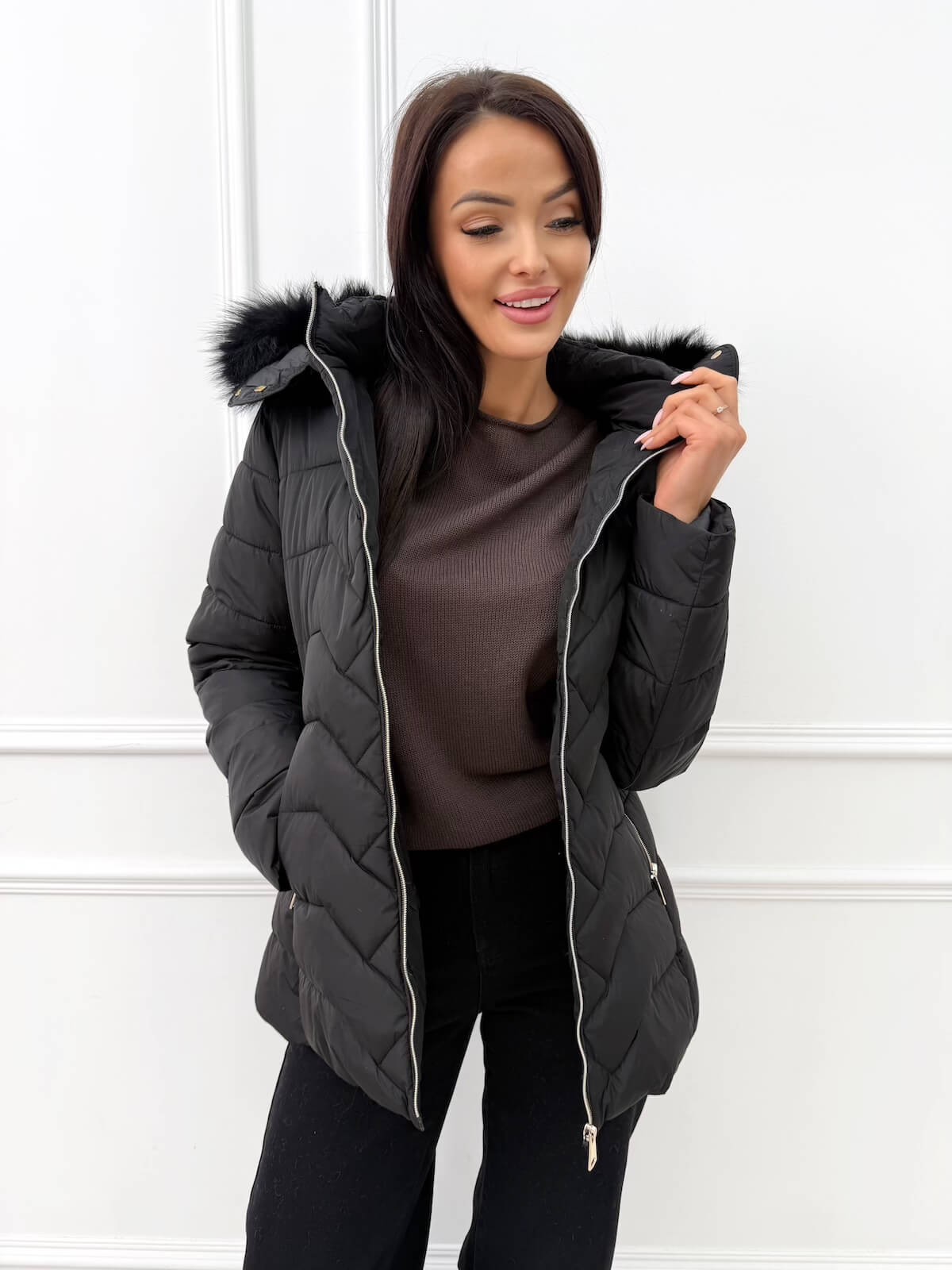 Czarna Pikowana Kurtka z Futerkiem przy Kapturze