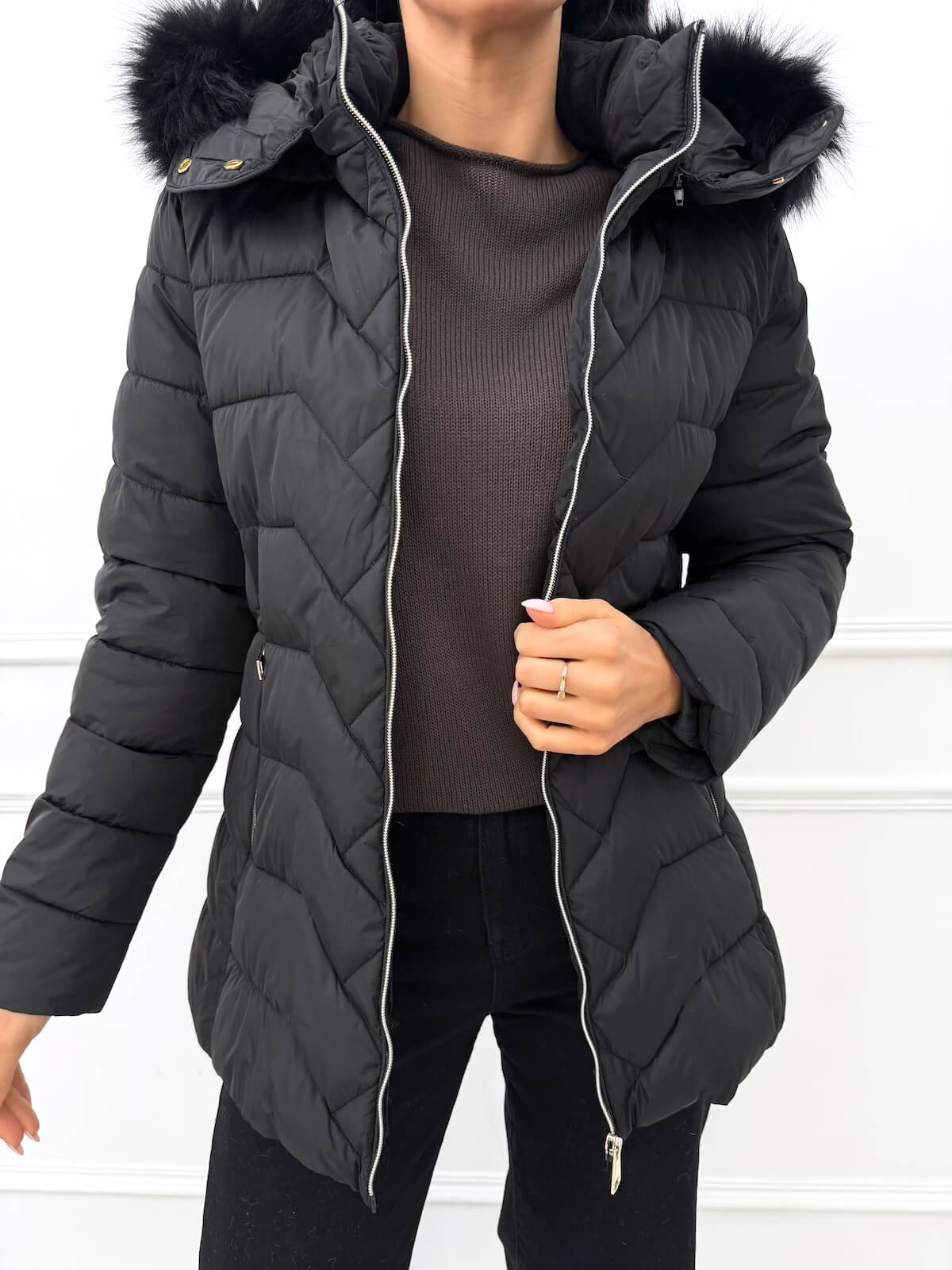 Ocieplana pikowana kurtka w klasycznym fasonie to doskonały wybór na chłodniejsze dni, łączący wygodę z nowoczesnym stylem. Zapinanie na zamek oraz praktyczne kieszenie na suwak zwiększają funkcjonalność, a odpinany kaptur z miękkim futerkiem dodaje subtelnej elegancji i zapewnia dodatkową ochronę przed zimnem. Zapięcie pod szyją na napy gwarantuje komfort i ciepło nawet podczas wietrznej pogody. Ten uniwersalny model znakomicie wpisuje się w codzienne miejskie trendy, stając się nieodłącznym elementem jesienno-zimowej garderoby.