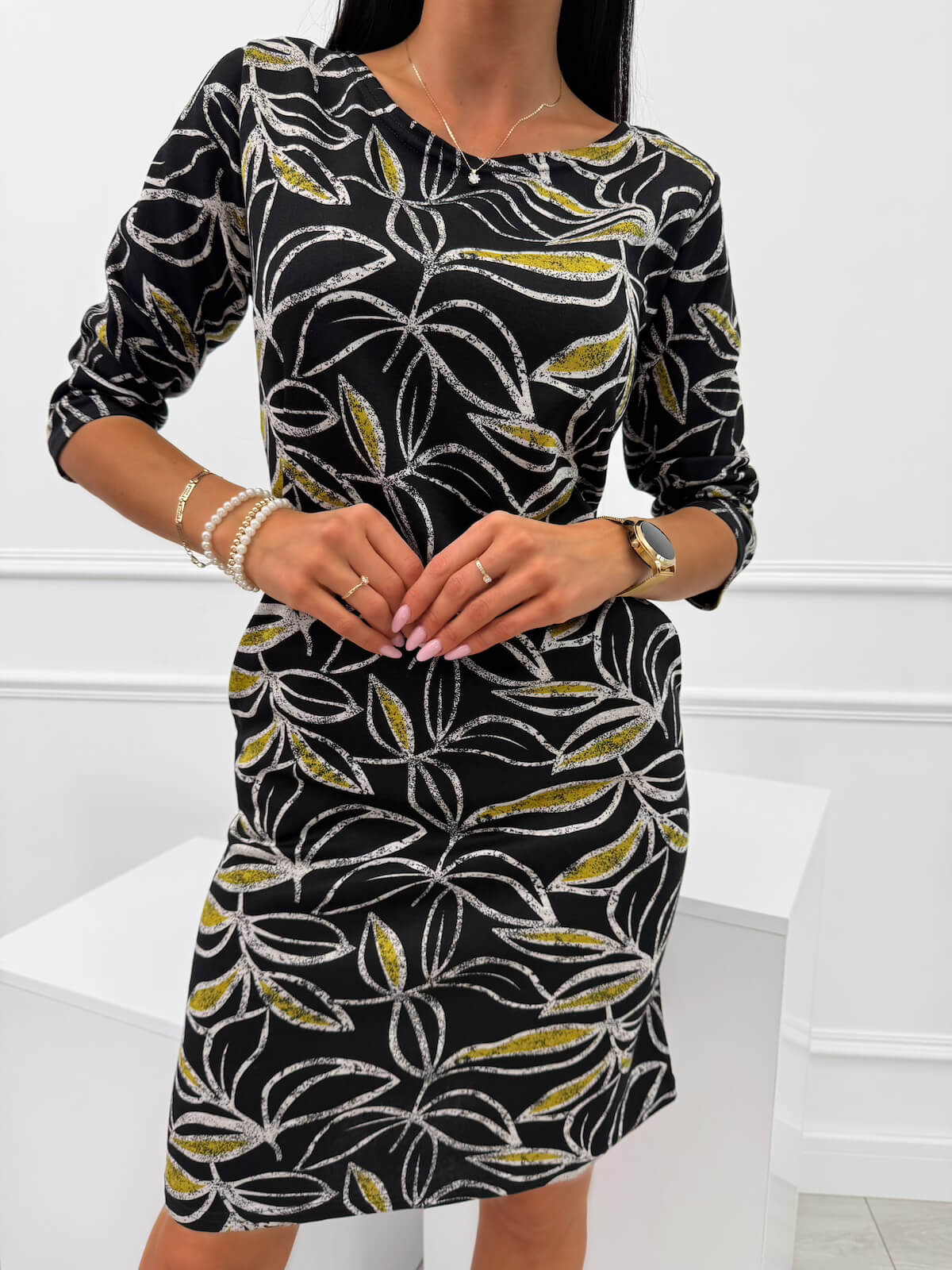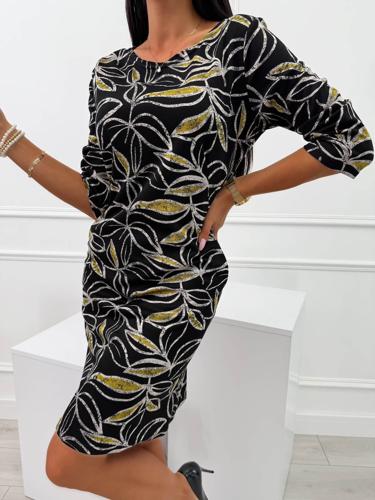 Czarna sukienka w delikatny wzór listków to stylowa propozycja, która łączy prostotę z subtelnym printem. Klasyczny krój z okrągłym dekoltem i rękawami 3/4 sprawia, że model prezentuje się lekko i swobodnie, a jednocześnie pozostaje wygodny na co dzień. Praktyczne kieszenie dodają funkcjonalności, nie zaburzając minimalistycznego fasonu. Idealna na jesienne dni i wiosenne wyjścia. Uniwersalna sukienka, która sprawdzi się zarówno w pracy, jak i na spotkaniu z przyjaciółmi. Modny wybór dla osób ceniących wygodę w kobiecym wydaniu.