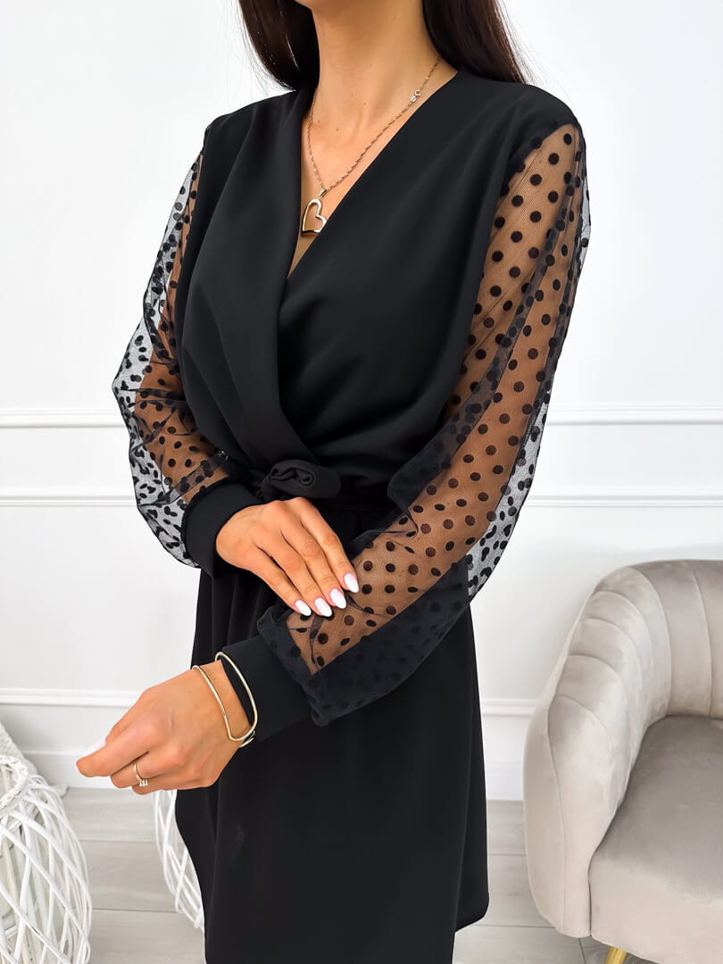 Elegancka sukienka z ozdobnym rękawem, która sprawdzi się zarówno na co dzień, jak i na różne okazje. Jednolita kolorystyka daje wiele możliwości przy doborze ciekawych dodatków. Sukienka posiada kopertowy, zakładany dekolt oraz gumeczkę w talii, która podkreśli atuty sylwetki. Rękawy wykonane z siateczki w urocze zamszowe groszki przełamują klasyczny fason oraz dodają szyku i elegancji. Ten fason będzie idealnym wyborem na oficjalne spotkanie, randkę czy uroczystość rodzinną.
