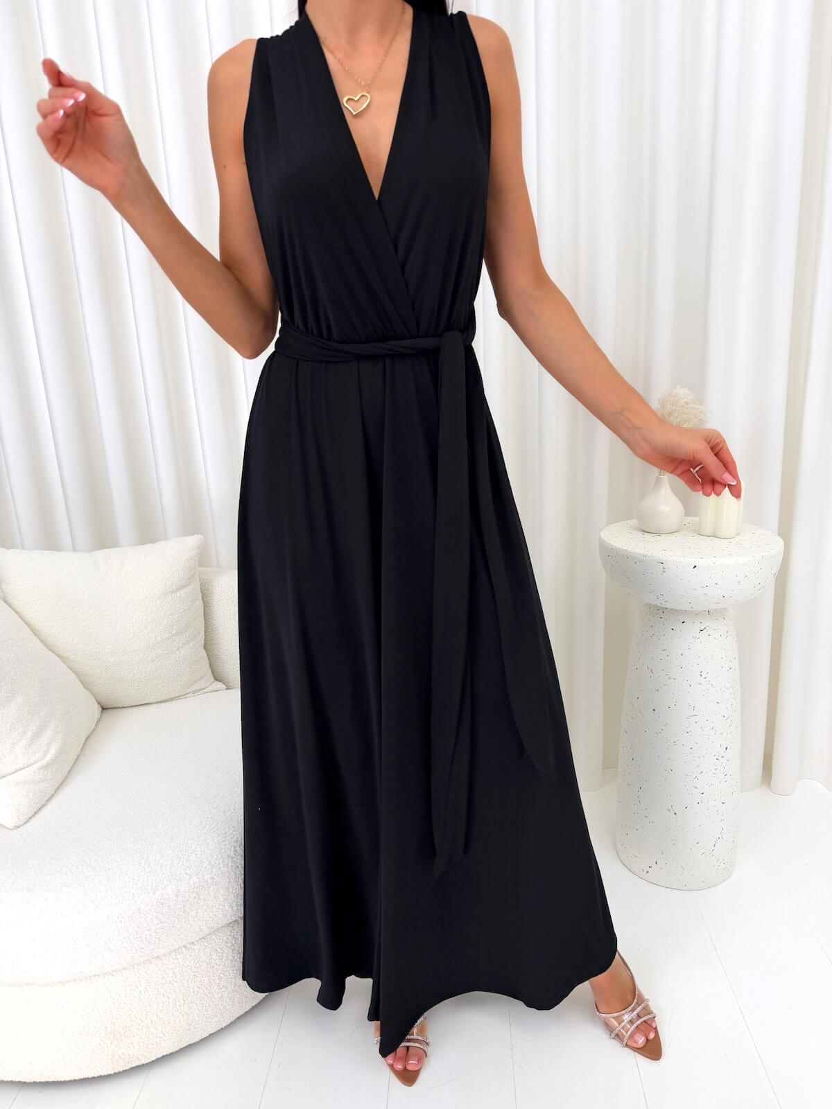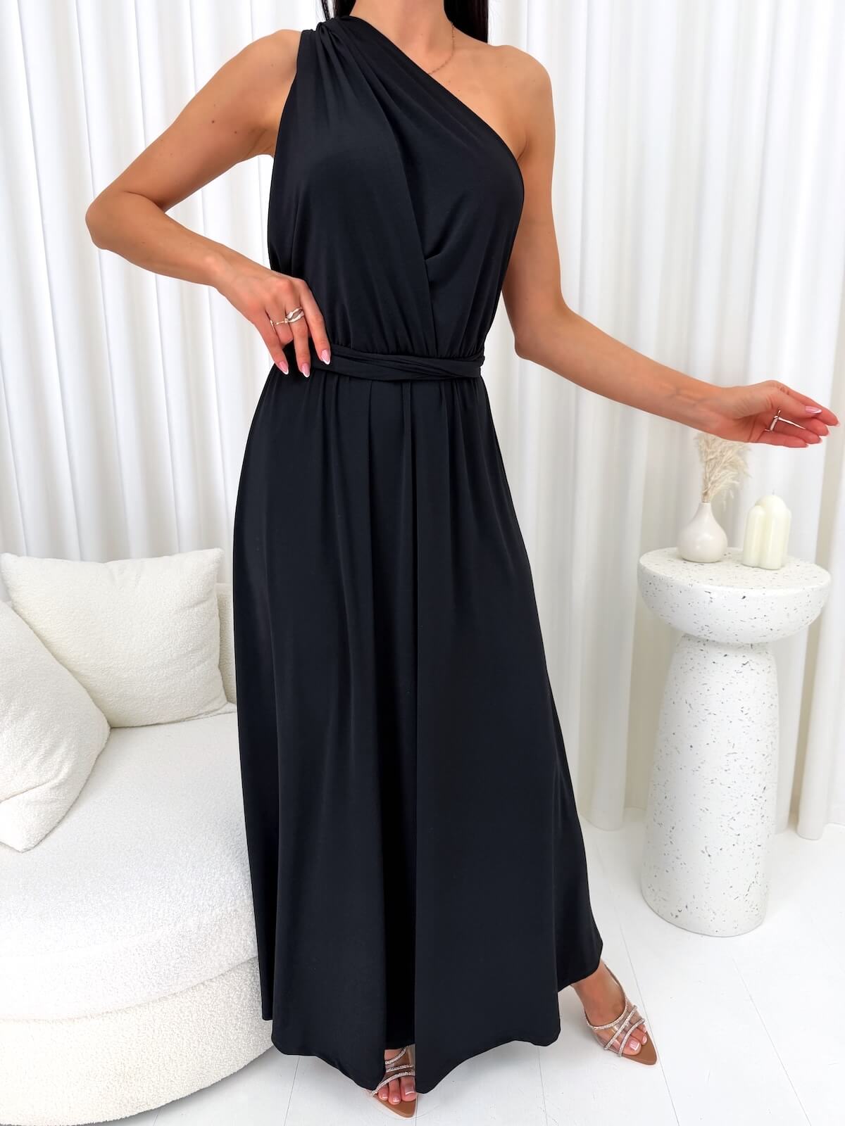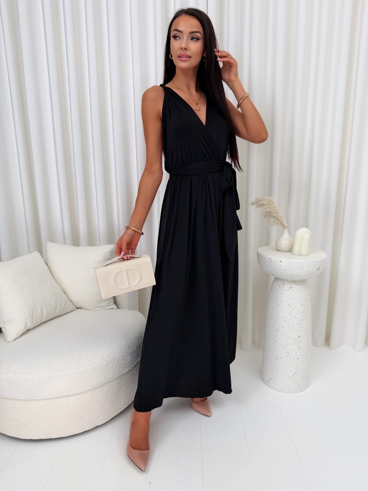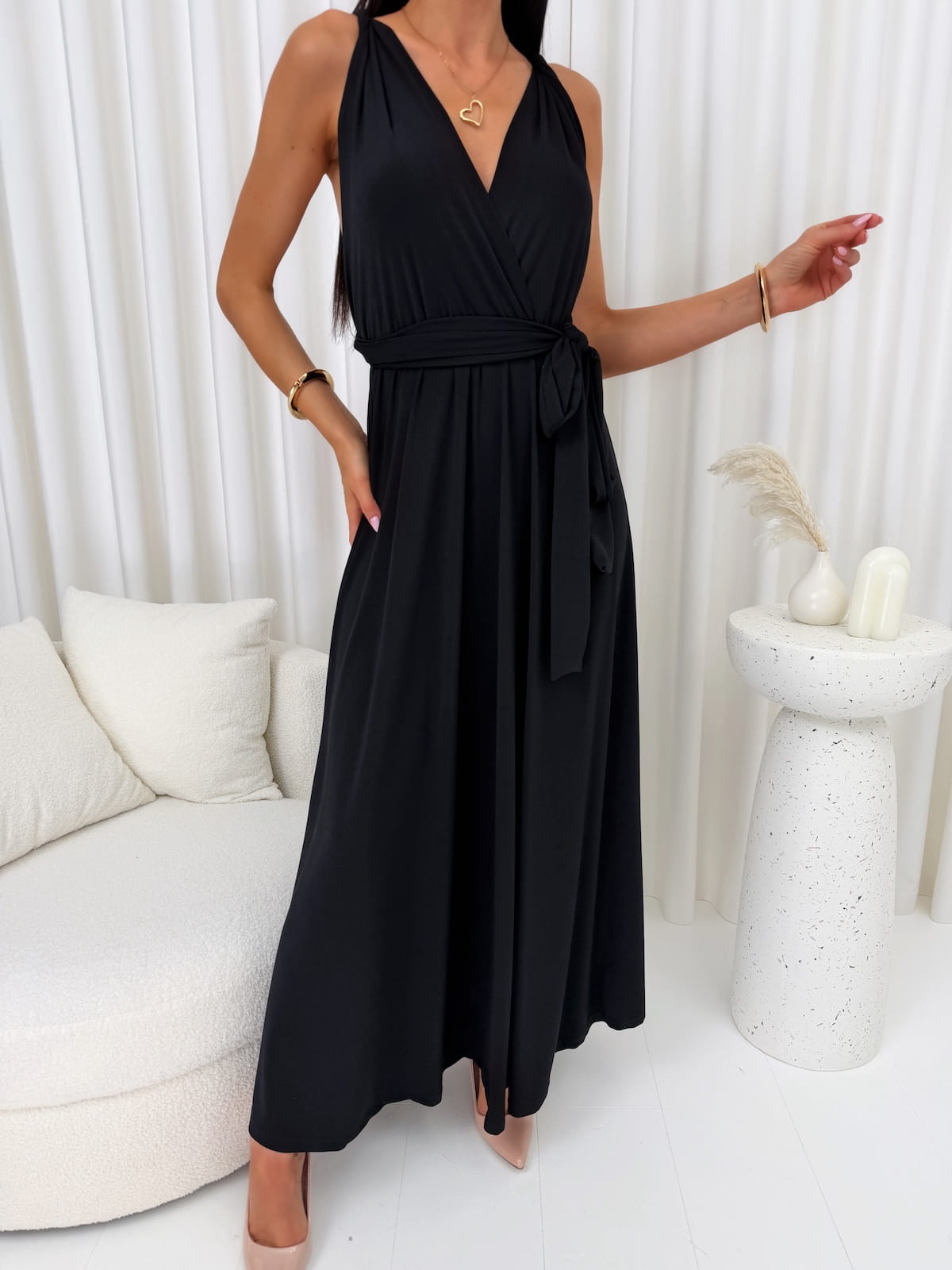 Czarna Sukienka z Wiązaną Górą to wyjątkowo kobieca i efektowna propozycja dla kobiet, które cenią wygodę oraz możliwość dopasowania fasonu do własnego stylu. Długość maxi nadaje całości lekkości i elegancji, a klasyczny czarny kolor sprawia, że sukienka prezentuje się szykownie, ponadczasowo i bardzo uniwersalnie. Model wyróżnia się górą z dwoma oddzielnymi pasami materiału, które można wiązać na różne sposoby, tworząc różne warianty dekoltu i ułożenia góry sukienki. Dzięki temu fason daje większą swobodę stylizacji i pozwala dopasować wygląd do okazji oraz własnych upodobań.