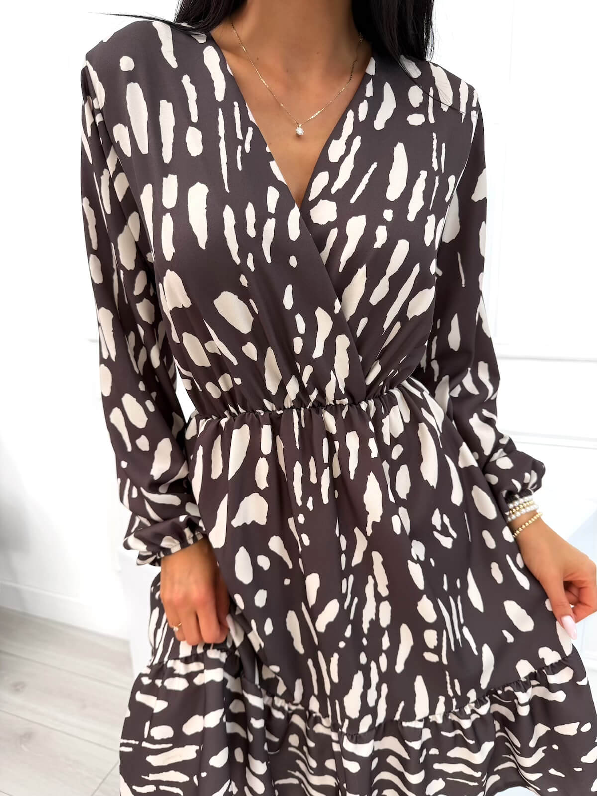 Zachwyca od pierwszego spojrzenia! Sukienka we wzory to prawdziwy hit sezonu — idealna dla tych, którzy lubią przyciągać spojrzenia. Kopertowy dekolt dodaje zmysłowości, a rozkloszowany krój z falbanką na dole tworzy efekt wow przy każdym ruchu. Gumka w talii podkreśla sylwetkę, a rękawy zakończone delikatną gumeczką nadają całości lekkości. Uniwersalna — sprawdzi się zarówno na spacer po mieście, jak i na wieczorne wyjście. Nie da się przejść obok niej obojętnie!