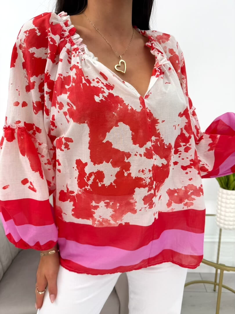 Wzorzysta bluzka o luźnym fasonie to stylowa i wygodna propozycja na różne okazje. Długie, bufiaste rękawy zakończone gumeczką dodają eleganckiego charakteru, a dekolt w kształcie litery V subtelnie podkreśla linię szyi. Wykonana z bawełny, gwarantuje przewiewność i komfort noszenia. Świetna propozycja na co dzień, do pracy, czy na spotkanie ze znajomymi.