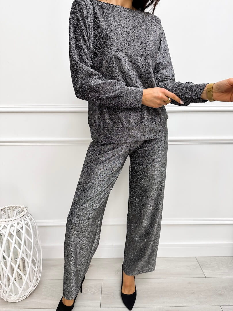 Grafitowy Połyskujący Komplet Bluzka + Spodnie 13312-176-B