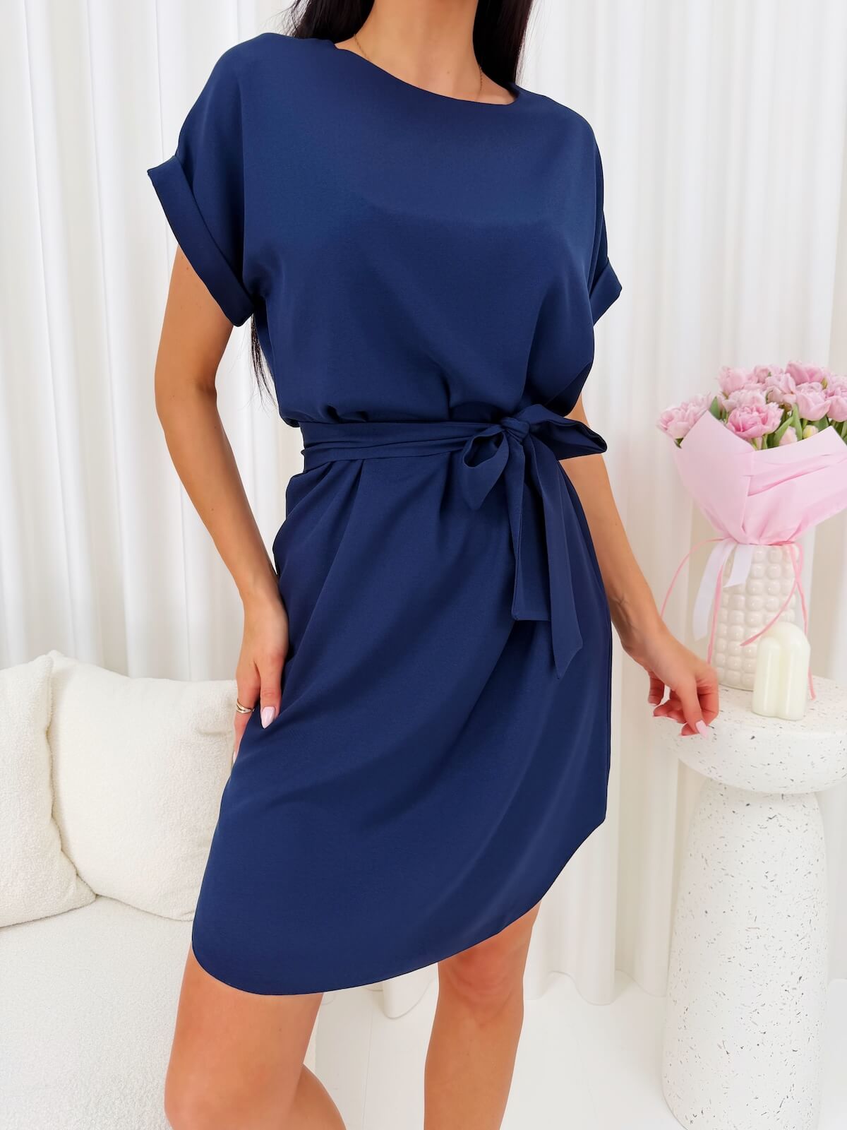 Granatowa klasyczna sukienka z paskiem to wygodna i bardzo uniwersalna propozycja, która świetnie sprawdzi się zarówno na co dzień, jak i w bardziej eleganckich stylizacjach. Luźny fason zapewnia swobodę ruchów i komfort noszenia, a dołączony materiałowy pasek pozwala w prosty sposób podkreślić talię i dopasować sukienkę do sylwetki. Okrągły dekolt nadaje całości ponadczasowego charakteru, a krótkie rękawy sprawiają, że model dobrze wygląda solo w cieplejsze dni, ale równie łatwo połączysz go z marynarką lub kardiganem. Bawełniana tkanina jest przyjemna w noszeniu i praktyczna, a nierozciągliwy materiał pomaga utrzymać formę i schludny wygląd przez cały dzień. Granat to kolor, który zawsze wygląda elegancko i pasuje do wielu dodatków, dlatego ta sukienka szybko stanie się jedną z tych, po które sięga się najczęściej.