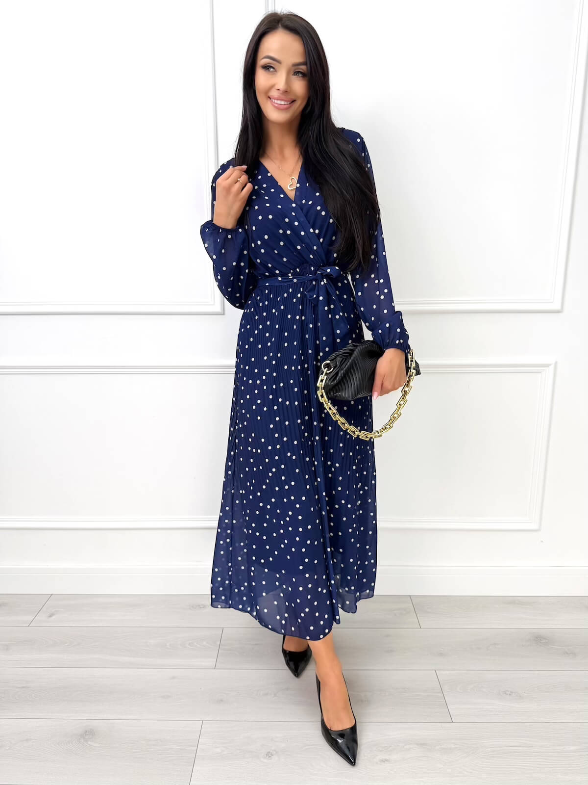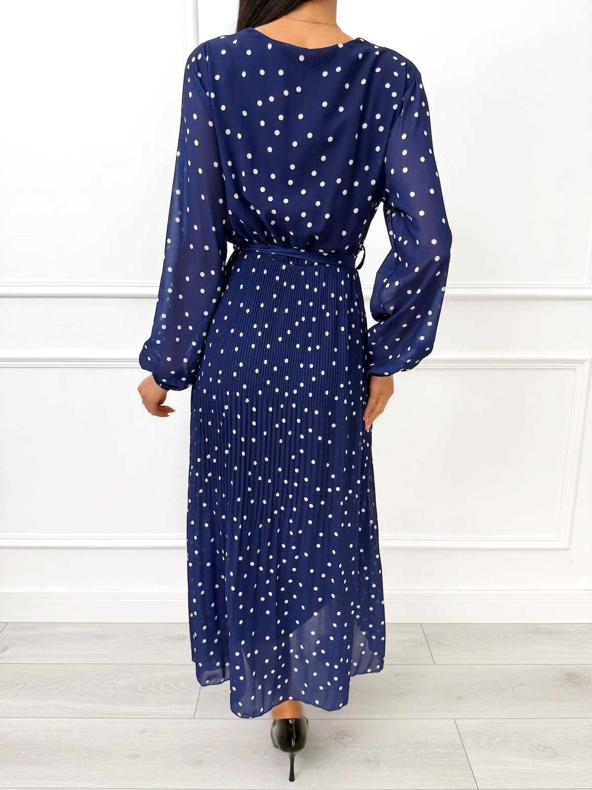 Granatowa Plisowana Sukienka w Groszki