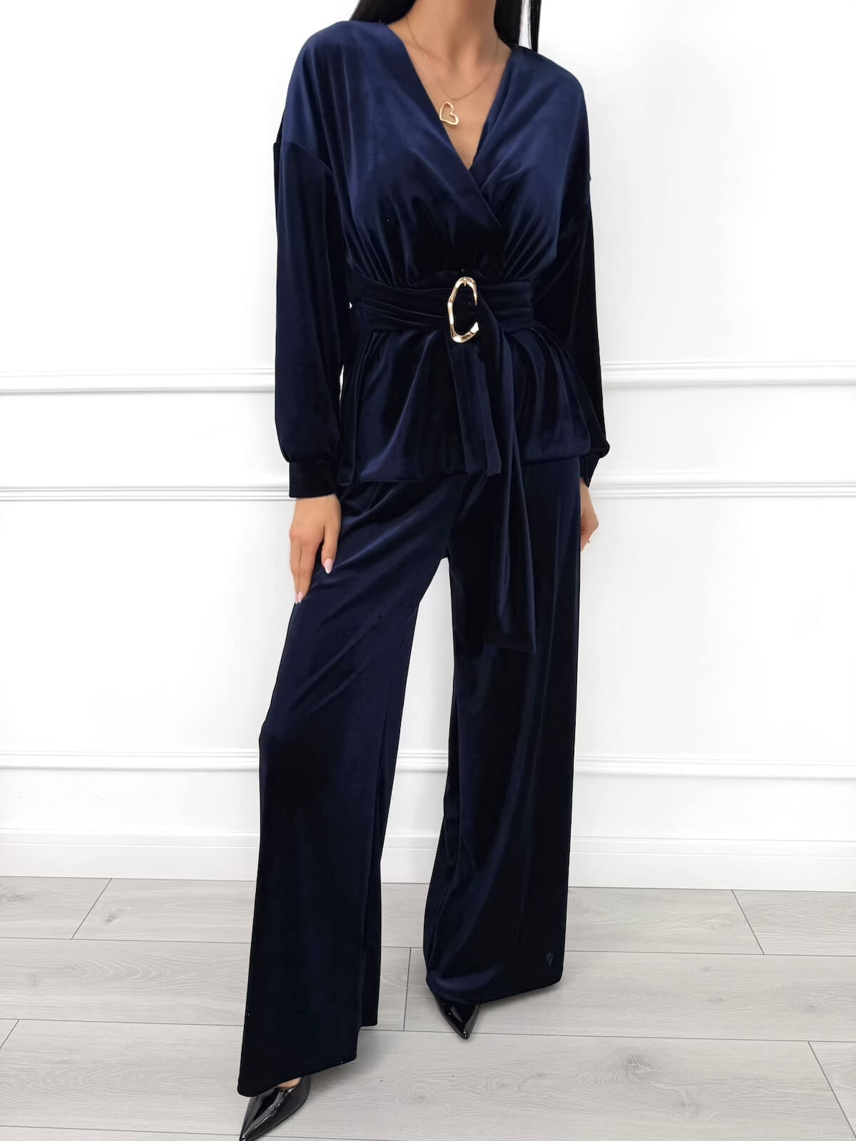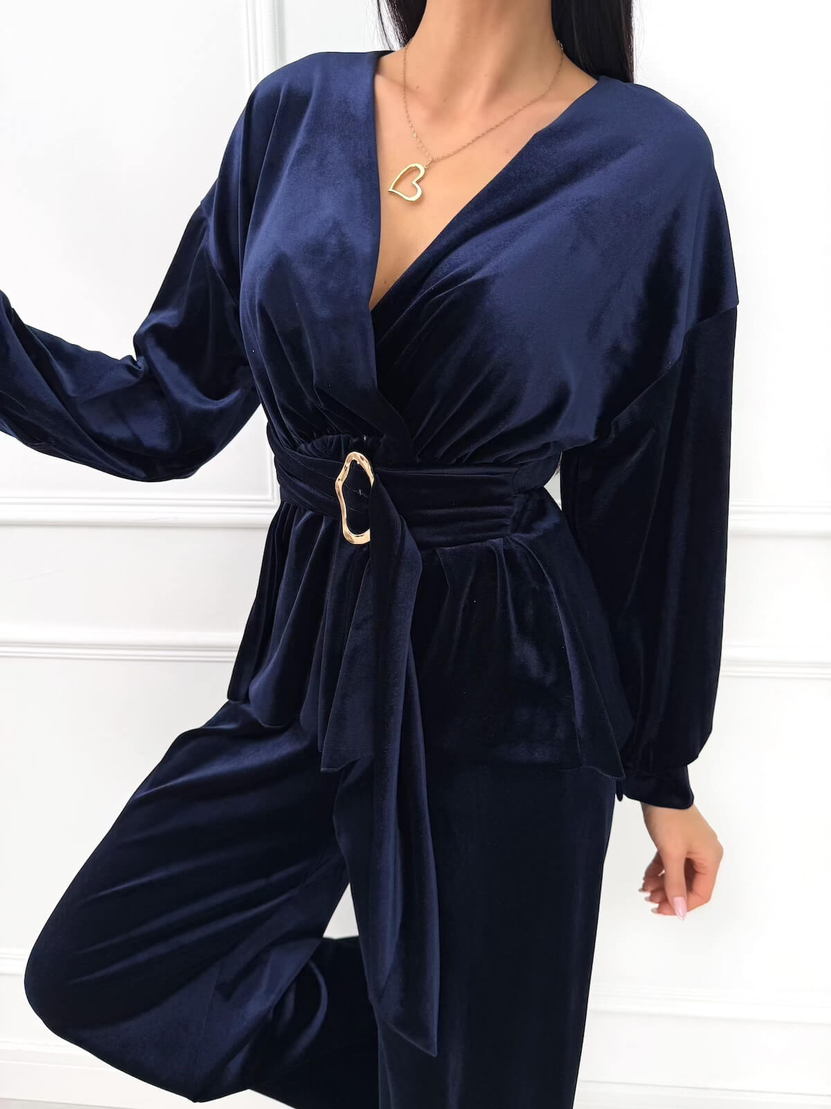 Ten welurowy komplet to połączenie klasy i wygody w najlepszym wydaniu. Miękka tkanina pięknie układa się na sylwetce, a taliowana bluzka z wszytym paskiem i ozdobną klamrą podkreśla kobiece kształty. Kopertowy dekolt dodaje elegancji, natomiast długie rękawy z mankietem zapinanym na guzik wprowadzają szykowny detal. Spodnie z szerokimi nogawkami i gumką w pasie gwarantują swobodę i komfort w każdej sytuacji. To stylowa propozycja idealna na chłodniejsze dni – modna, efektowna i niezwykle uniwersalna.