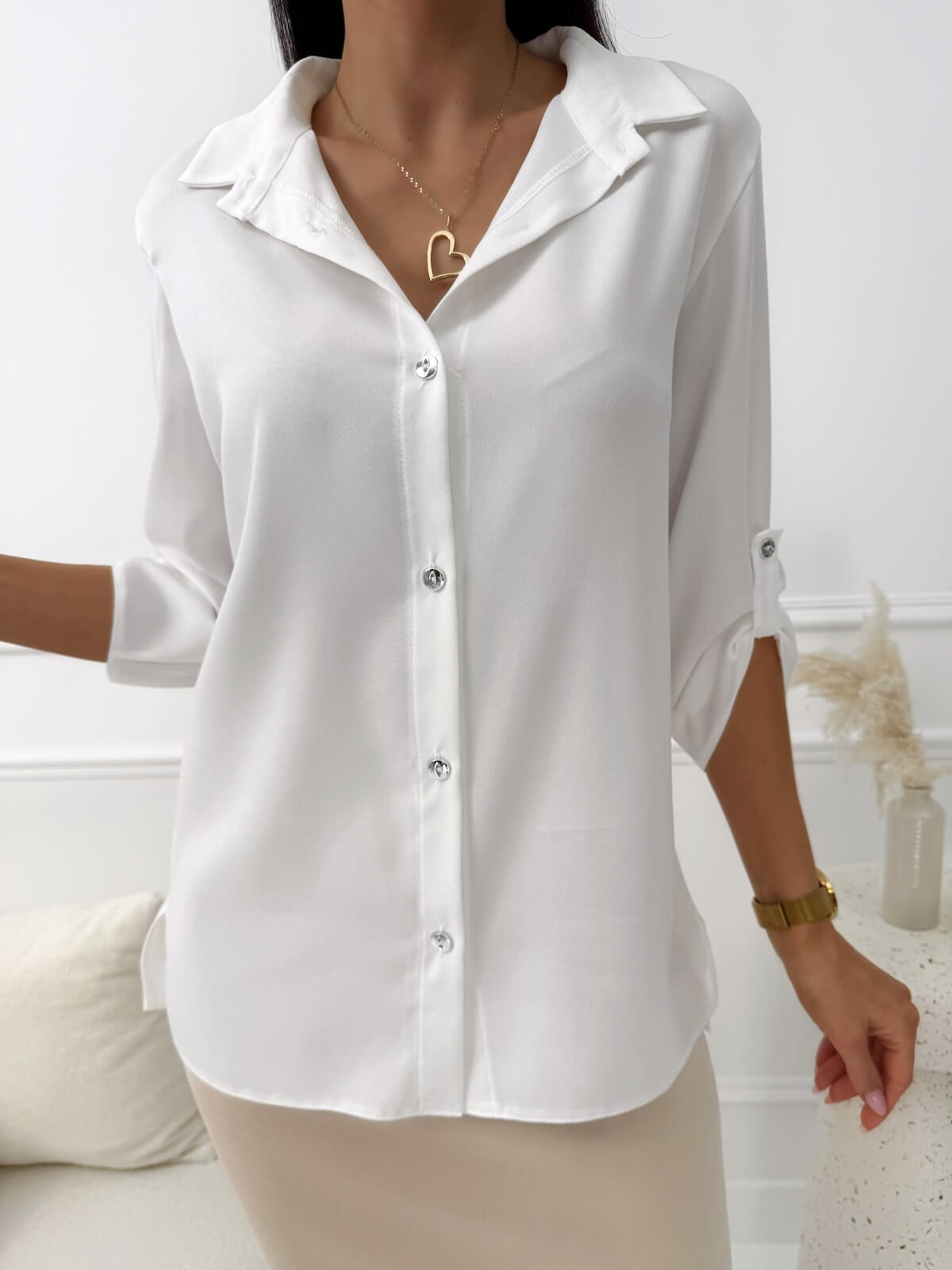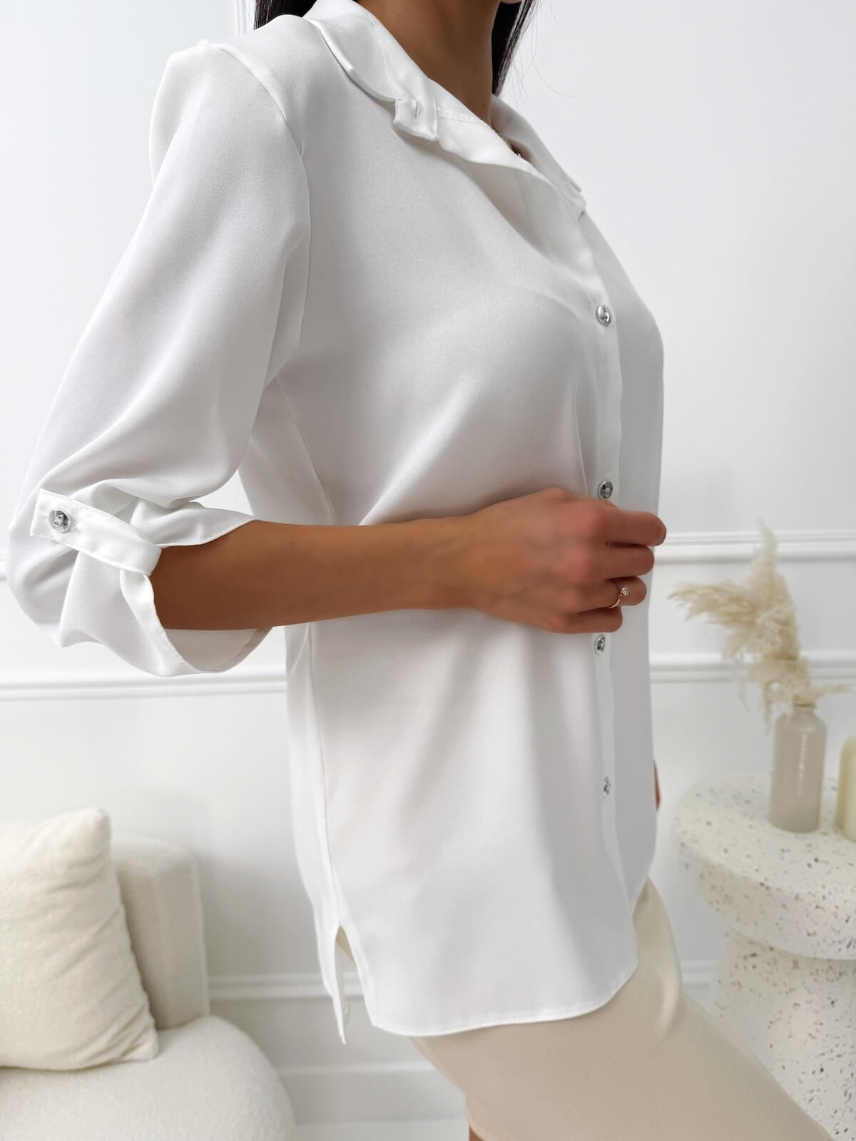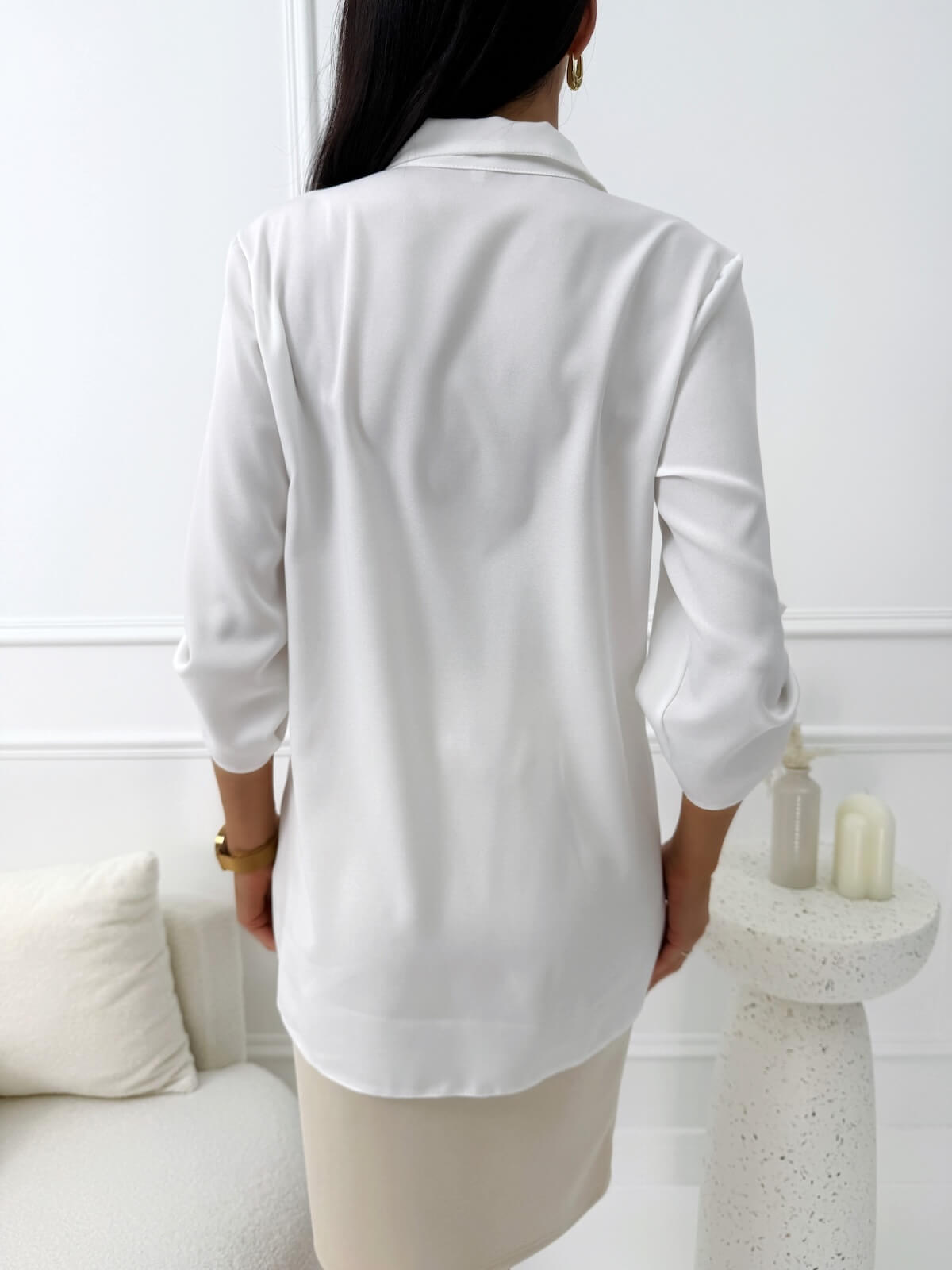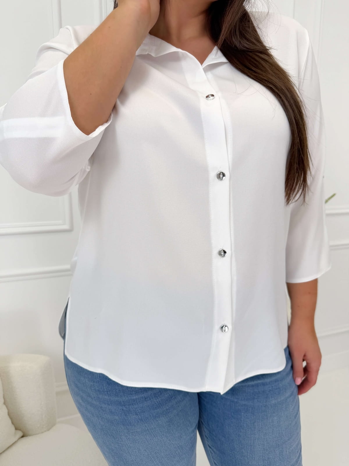Koszula w jednolitym kolorze to uniwersalny element garderoby, który daje mnóstwo możliwości stylizacji. Luźny krój zapewnia swobodę i miękko układa się na sylwetce, a asymetryczna długość z krótszym przodem sprawia, że całość wygląda lekko i świetnie komponuje się ze spodniami lub spódnicą z wyższym stanem. Zapięcie na guziki pozwala nosić ją klasycznie lub jako narzutkę na top, a regulowane rękawy 3/4 łatwo dopasować do okazji. To idealna propozycja do pracy, na spotkania i na co dzień – wystarczy dodać jeansy, cygaretki lub szorty, by uzyskać stylowy, kobiecy efekt.