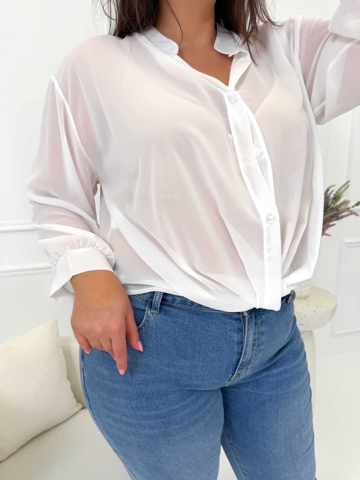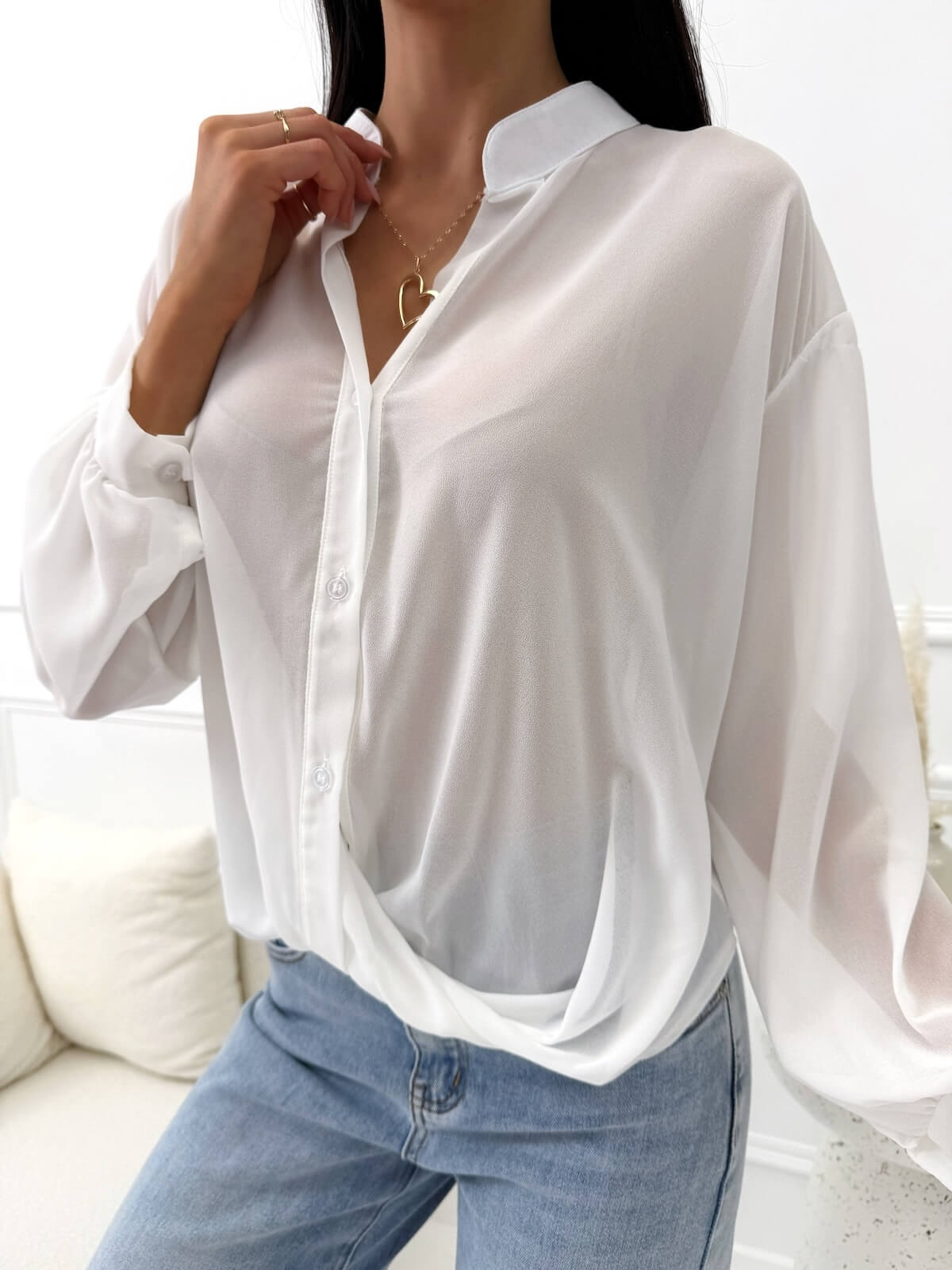 Bluzka w stylu koszuli w jednolitym kolorze to lekka i elegancka propozycja, która wyróżnia się subtelną formą i nowoczesnym wykończeniem. Luźny fason swobodnie układa się na sylwetce, zapewniając komfort noszenia i kobiecy wygląd. Szyfonowy, lekko prześwitujący materiał dodaje całości lekkości i sprawia, że bluzka prezentuje się wyjątkowo stylowo. Zapięcie na guziki oraz przekładany materiał u dołu tworzą ciekawy efekt wizualny, a możliwość zakładania przez głowę podkreśla jej oryginalny charakter. Długie rękawy czynią model uniwersalnym wyborem do pracy, na spotkania czy bardziej eleganckie wyjścia, kiedy liczy się dopracowana, a zarazem lekka stylizacja.