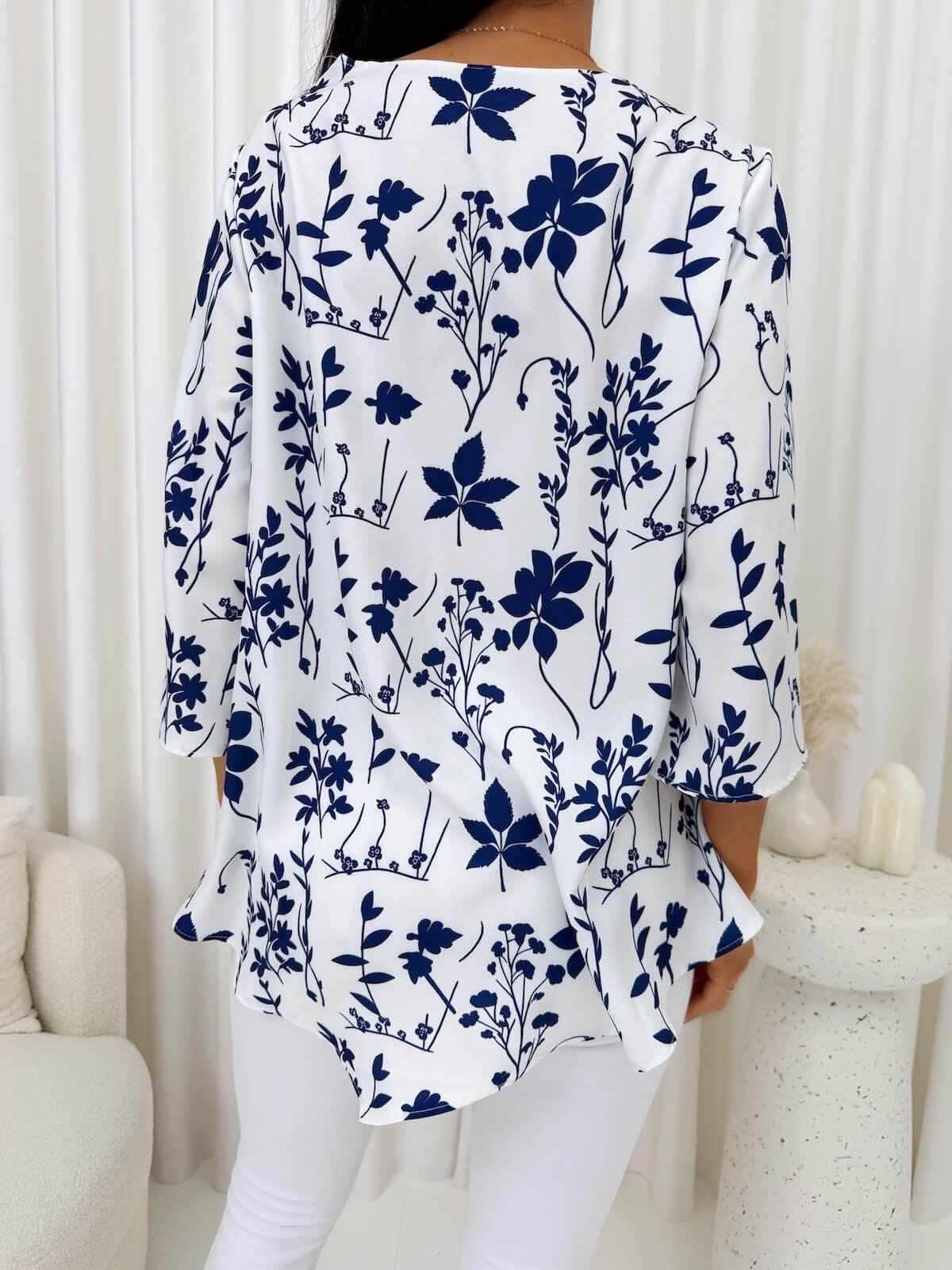 Kremowo-granatowa asymetryczna bluzeczka to propozycja dla kobiet, które cenią wygodę, lekkość i subtelnie wyróżniający się styl. Luźny fason pięknie układa się na sylwetce, zapewnia swobodę ruchów i sprawia, że model doskonale wpisuje się w codzienne, kobiece stylizacje. Wzór na bluzce dodaje całości wyrazistości i dekoracyjnego charakteru, a kremowo-granatowa kolorystyka prezentuje się elegancko, harmonijnie i bardzo stylowo. Asymetryczna długość z wydłużonym bokiem przyciąga spojrzenia i nadaje fasonowi nowoczesnego wykończenia, dzięki czemu bluzeczka wygląda lekko, modnie i niebanalnie.