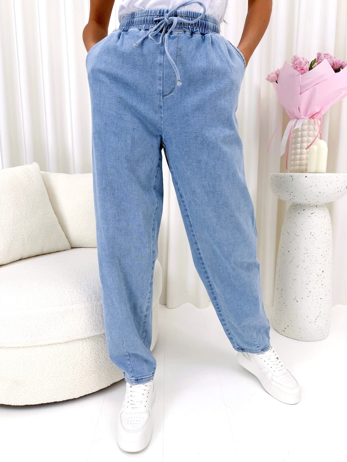 Wygodne Niebieskie Jeansowe Spodnie Balloon z Gumką w Pasie