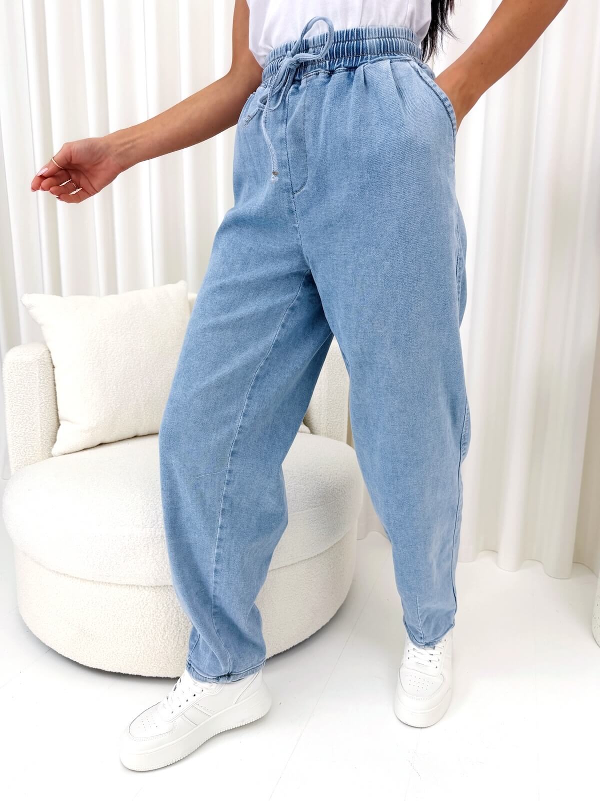 Niebieskie jeansowe spodnie balloon z gumką w pasie to wygodna i bardzo modna propozycja dla kobiet, które lubią luźniejsze fasony, ale nadal chcą zachować świetne proporcje sylwetki. Krój balloon delikatnie buduje objętość w okolicy bioder i ud, a następnie zwęża się ku dołowi, dzięki czemu spodnie wyglądają nowocześnie i stylowo. Gumka w pasie z wiązaniem pozwala dopasować je do talii tak, jak lubisz – to ogromny plus na co dzień, kiedy zależy Ci na komforcie bez ucisku. Kieszonki z przodu dodają praktyczności, a dodatkowa kieszeń z tyłu przełamuje klasyczny jeansowy look i podkreśla casualowy charakter modelu. Niebieski odcień świetnie łączy się z bielą, beżem, szarością i czernią, dlatego z łatwością zbudujesz zarówno sportową, jak i bardziej miejską stylizację.