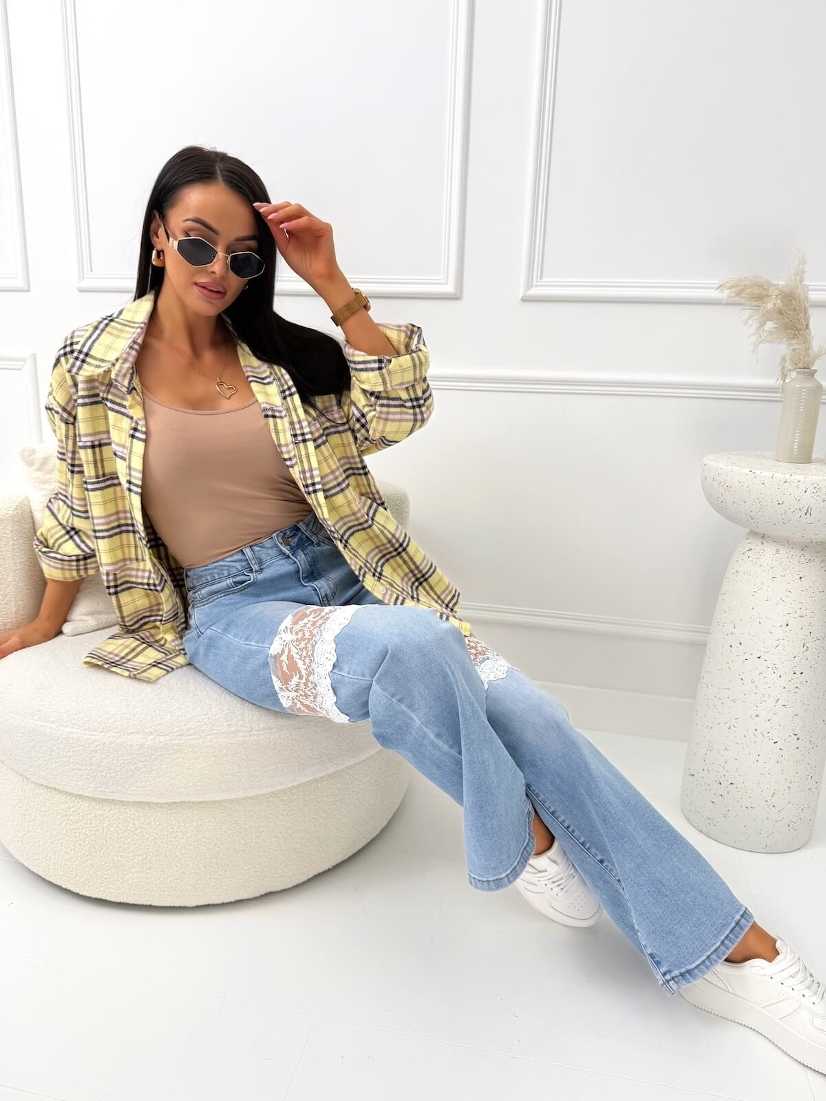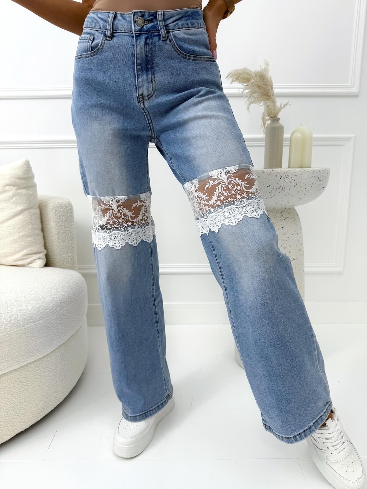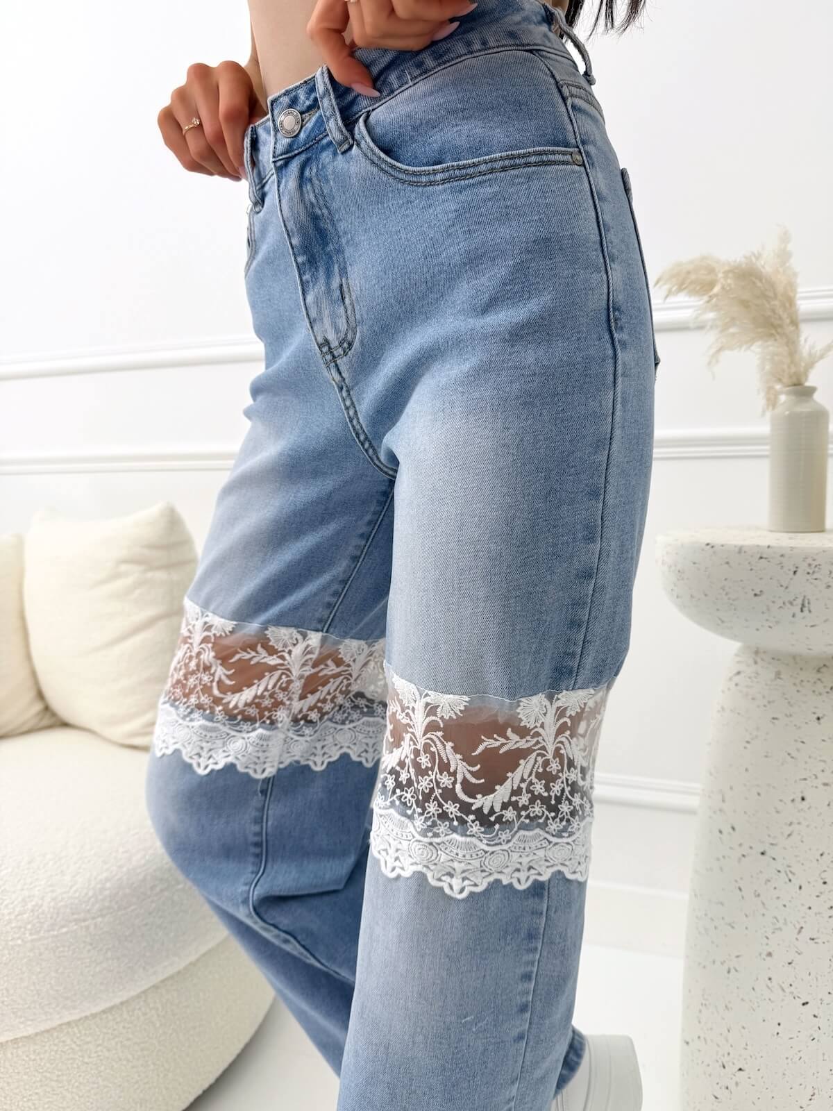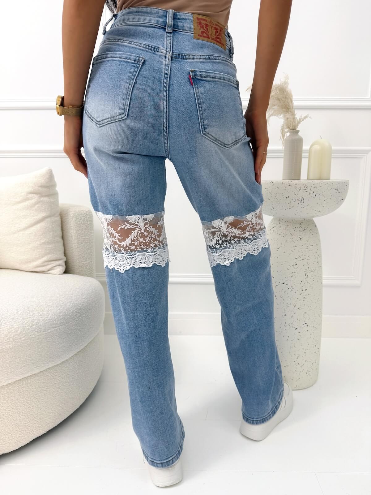 Niebieskie Jeansowe Spodnie z Ozdobnymi Wstawkami z Koronki 14677-17-B