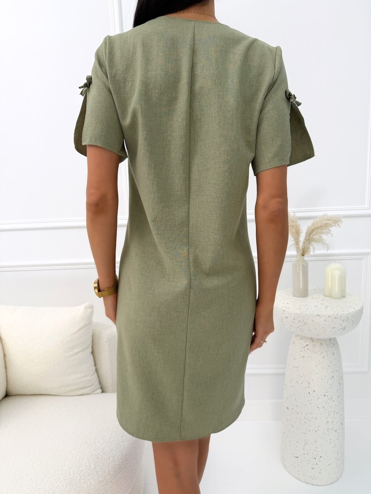 Sukienka w jednolitym kolorze to elegancka baza, która zachwyca detalem. Prosty fason układa się swobodnie na sylwetce, zapewniając komfort i estetyczny efekt, a lekki materiał sprawia, że noszenie jej jest przyjemne przez cały dzień. Największą ozdobą są krótkie rękawy z delikatnymi rozcięciami i subtelną kokardką – ten akcent dodaje całości kobiecego uroku i sprawia, że stylizacja wygląda wyjątkowo dopracowanie. To uniwersalny model na co dzień, do pracy i na spotkania: wystarczy dobrać sandałki lub sneakersy, a na bardziej eleganckie wyjście postawić na szpilki i biżuterię.