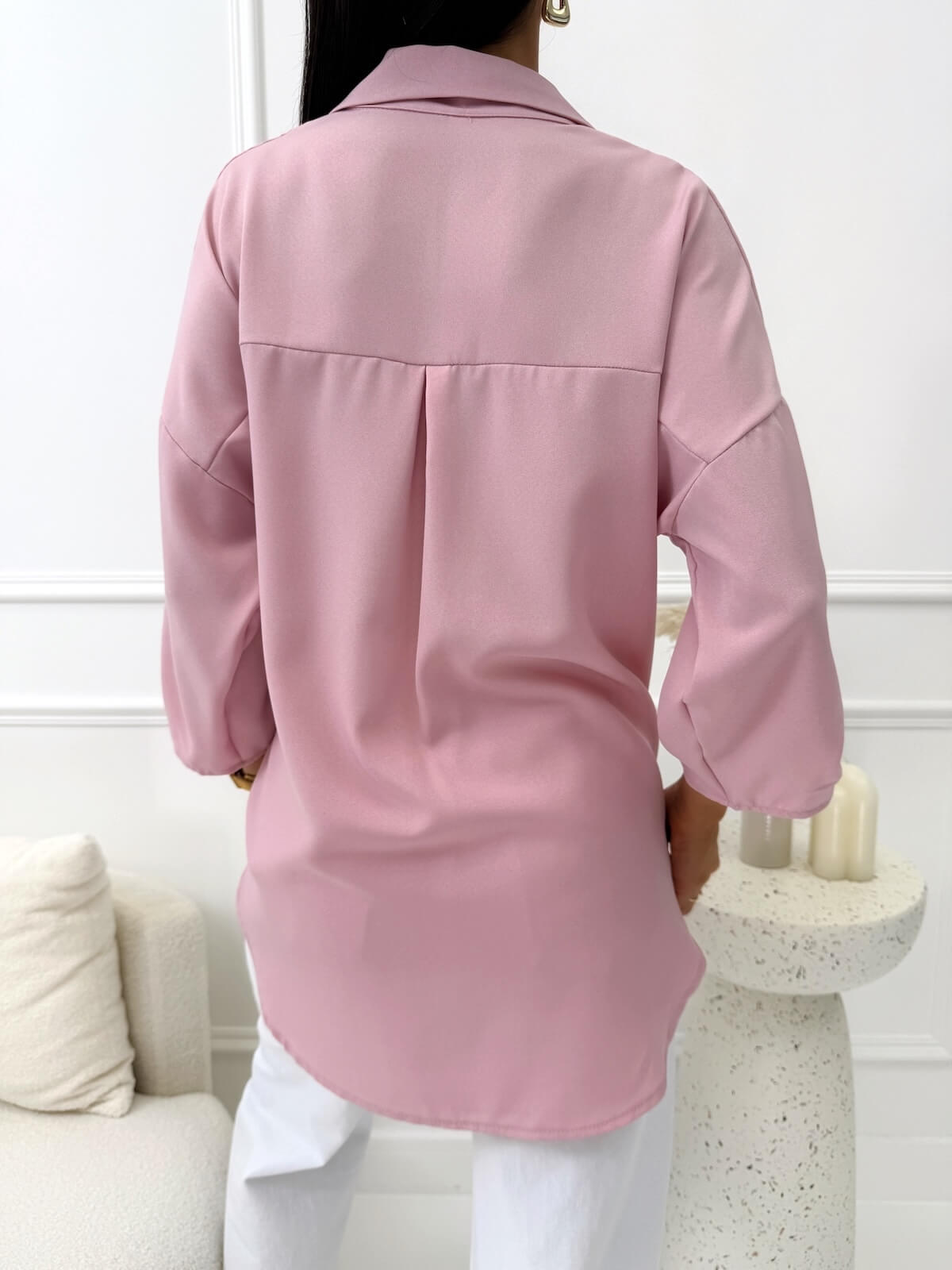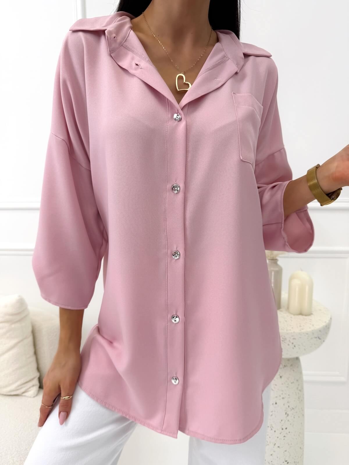 Koszula w jednolitym kolorze to uniwersalna propozycja, która doskonale wpisuje się w codzienne, kobiece stylizacje. Luźny krój swobodnie układa się na sylwetce, zapewniając komfort noszenia i lekkość formy. Rękawy o długości 3/4 z możliwością regulacji pozwalają dopasować koszulę do okazji, a zapięcie na guziki nadaje całości klasycznego charakteru. Kieszonka na biuście stanowi subtelny detal, natomiast lekko asymetryczna długość z krótszym przodem optycznie wysmukla sylwetkę i dodaje stylizacji nowoczesnego akcentu. To model, który świetnie sprawdza się zarówno do pracy, jak i w casualowych zestawach na co dzień.