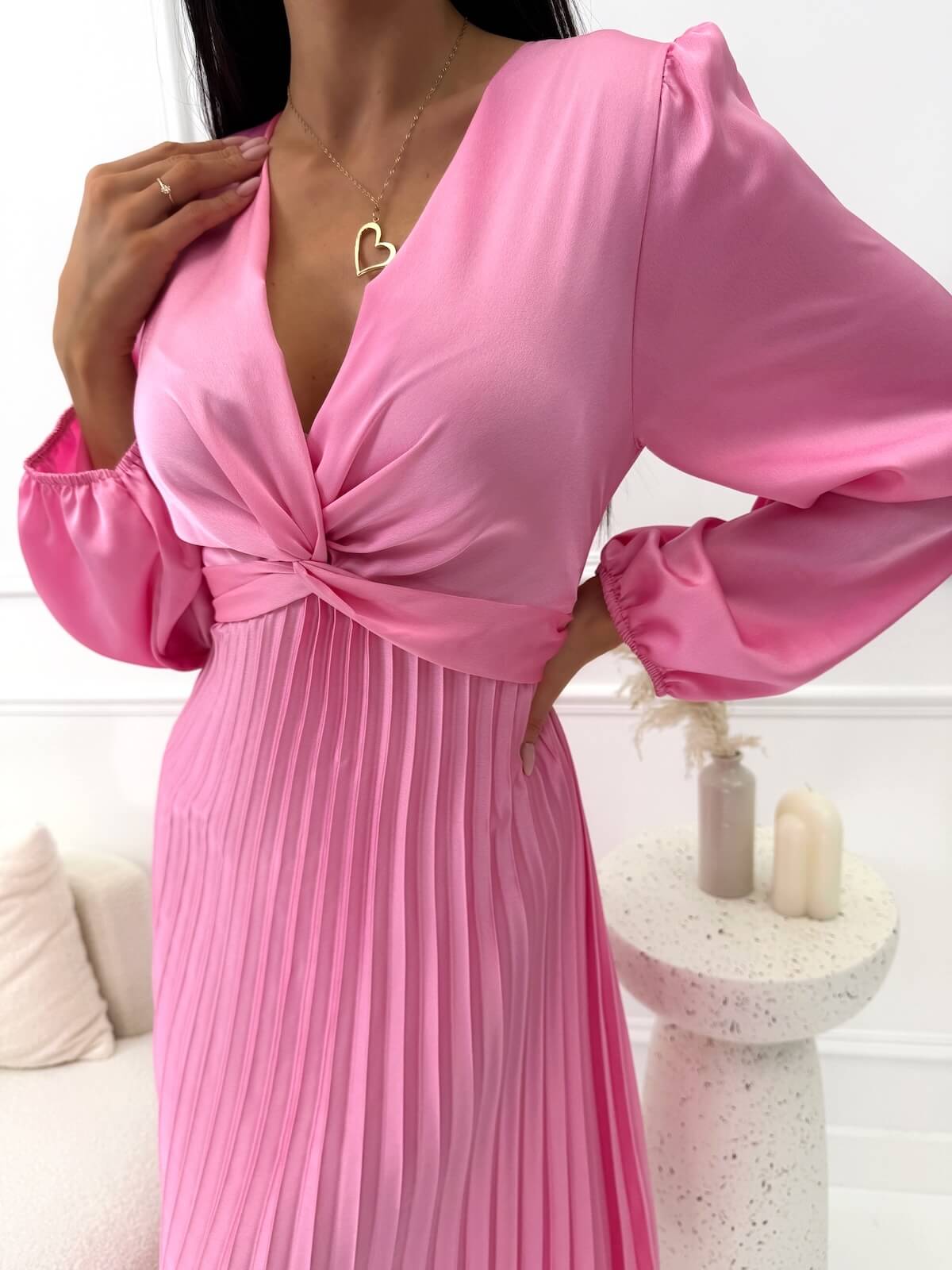 Pudrowa Satynowa Sukienka z Plisowanym Dołem 14686-125-B