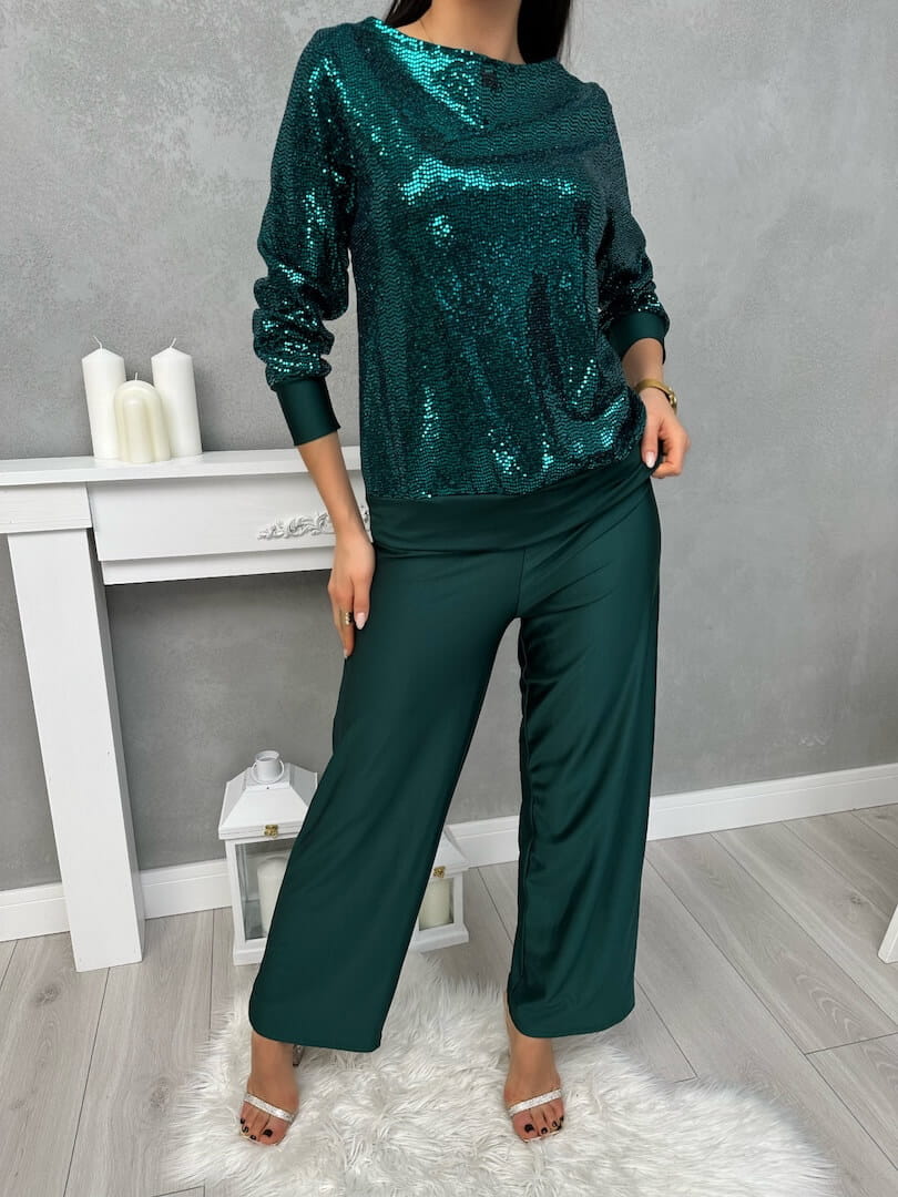 Komplet składający się z bluzki z długim rękawem i spodni, który bez wątpienia świetnie sprawdzi się w wielu okazjonalnych look'ach. Gumeczka w pasie sprawia, że komplet jest niezwykle praktyczny i wygodny. Bluzka zdobiona jest cekinami, co świetnie urozmaica klasyczny fason oraz nadaje oryginalności całej stylizacji. To rewelacyjna propozycja na randkę, na spotkanie czy inne okazjonalne wyjście.