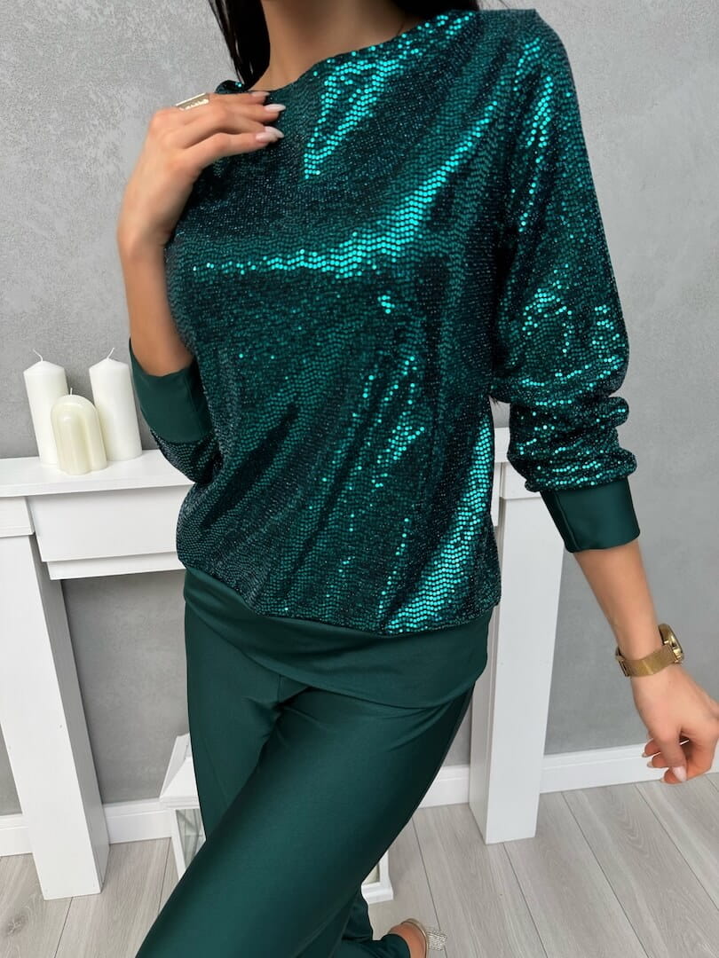 Zielony Połyskujący Komplet Bluzka + Spodnie