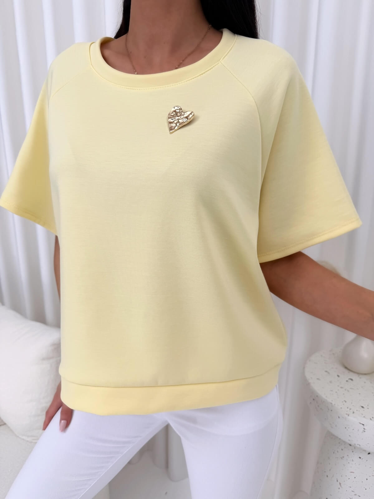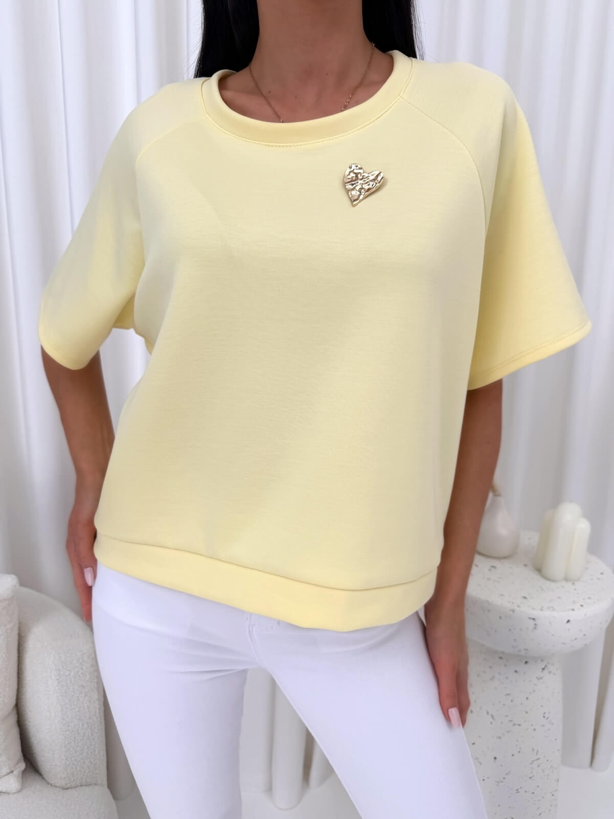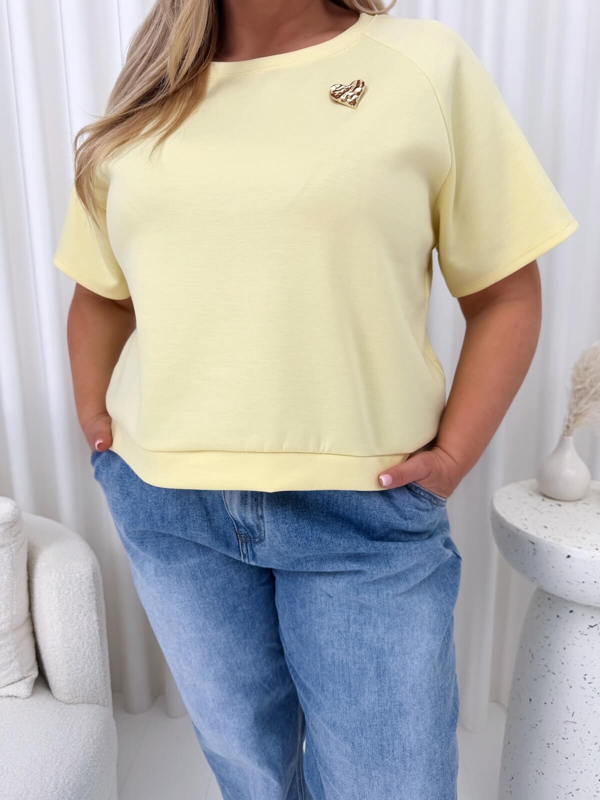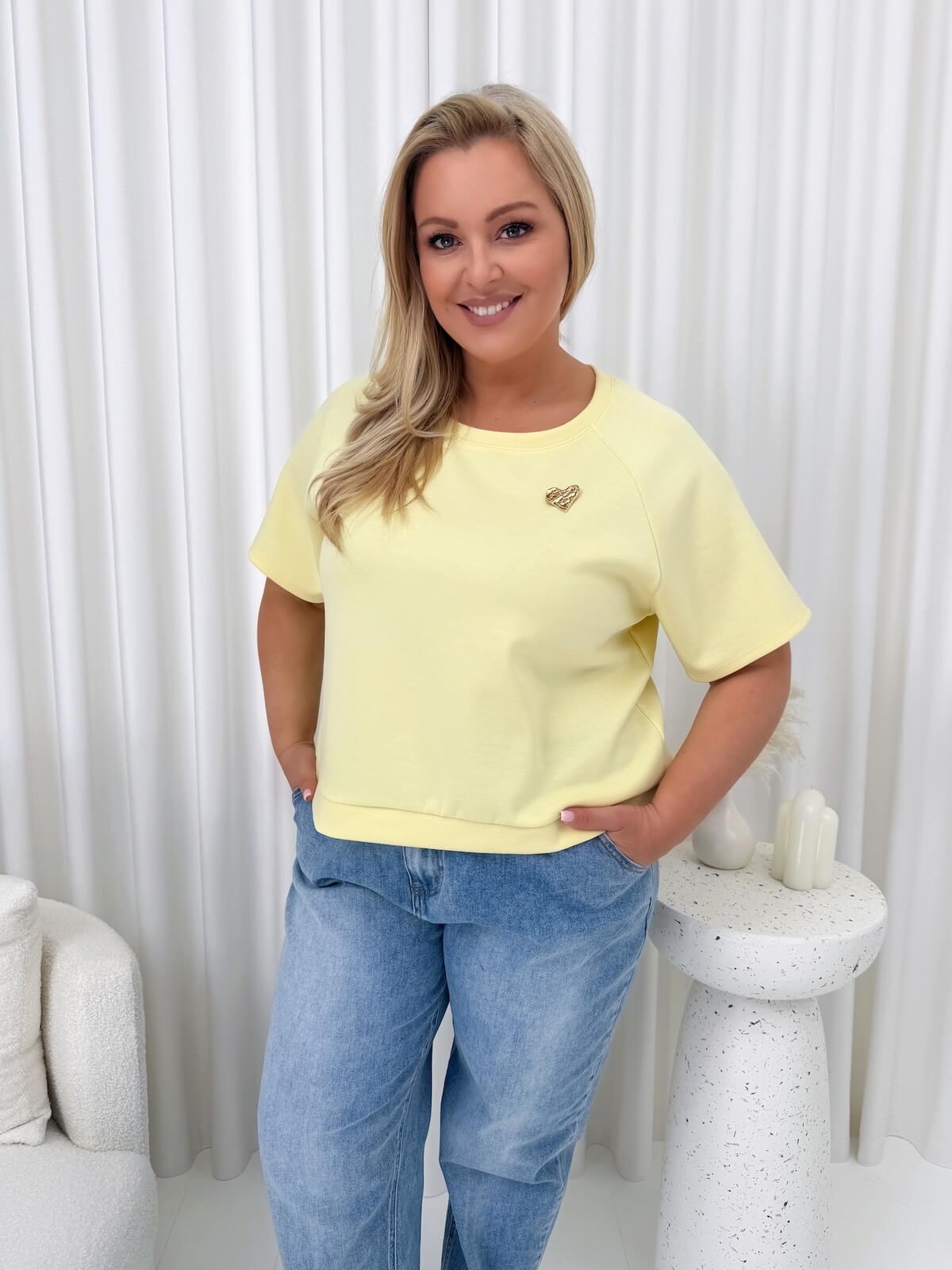 Żółta masełkowa bluzka z broszką to model, który wnosi do stylizacji świeżość, lekkość i kobiecy akcent. Słoneczny odcień pięknie ożywia look, dodając mu energii, a luźny fason sprawia, że bluzka swobodnie układa się na sylwetce i zapewnia wysoki komfort noszenia. Okrągły dekolt oraz krótkie rękawy nadają jej uniwersalnego charakteru, dzięki czemu z łatwością dopasujesz ją do codziennych i bardziej dopracowanych zestawów. Odpinana biżuteryjna broszka stanowi eleganckie wykończenie, które pozwala w prosty sposób zmienić charakter stylizacji.